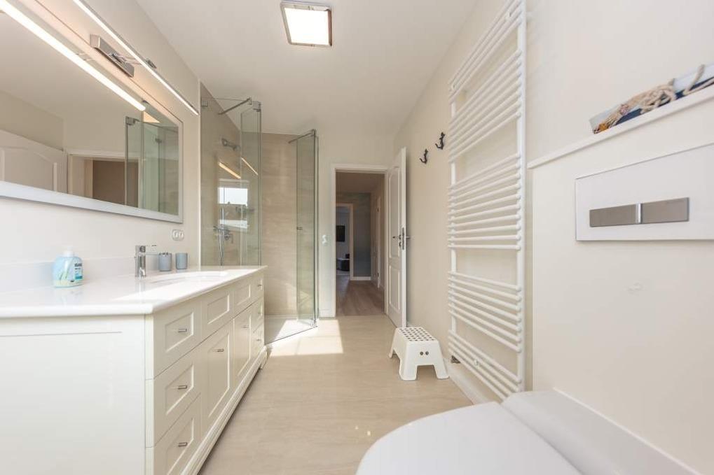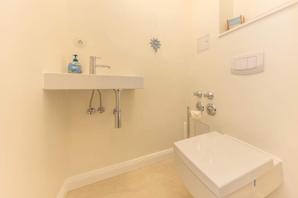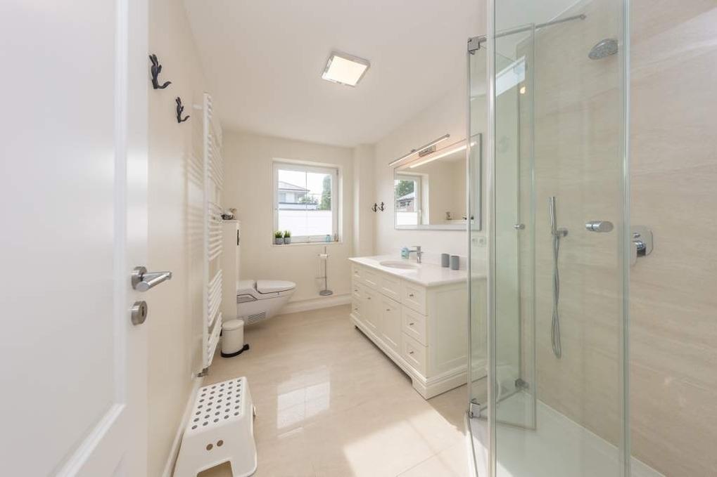 Die Timmendorfer Strand Ferienwohnung verfügt über ein Badezimmer mit Dusche sowie ein zusätzliches Gäste-WC.