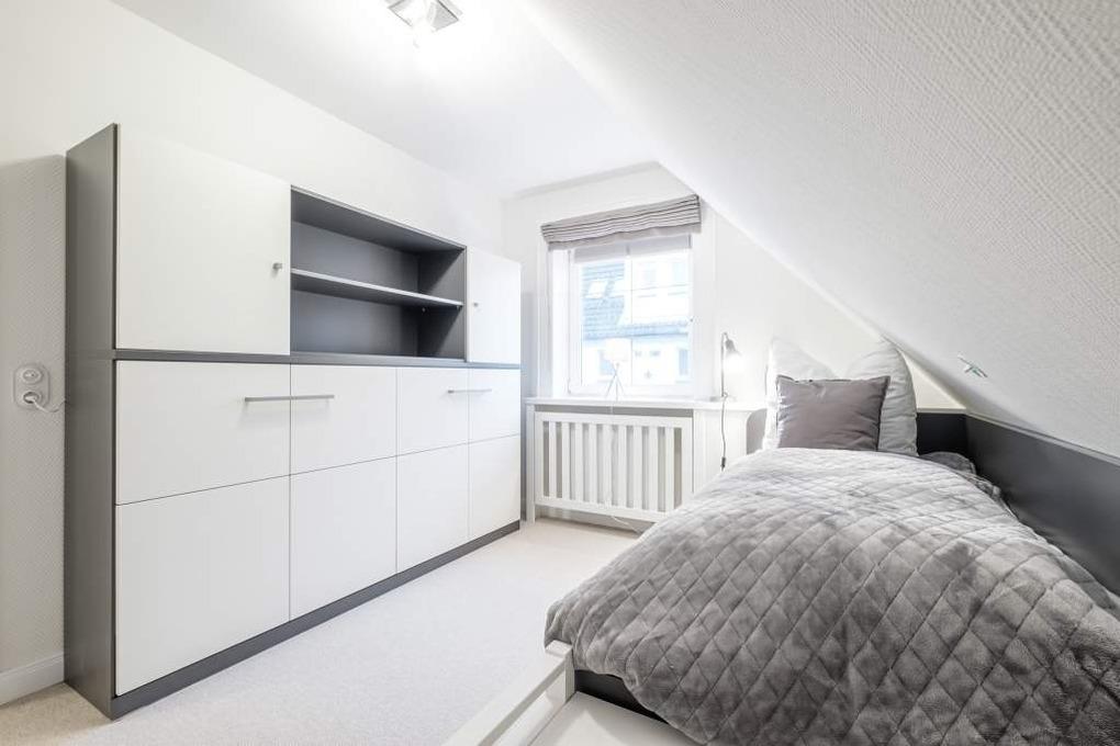 Das Schlafzimmer I bietet Ihnen mit einem hochwertigen Boxspringbett (1,80m x 2,00m) sowie einem zusätzlichen 2. TV eine Ruheoase für erholsame Stunden. Im Schlafzimmer II erwarten Sie für die dritte und vierte Person ein freistehendes Einzelbett sowie ein wertiges Schrankbett, dass bei Belegung mit vier Personen als Schlafmöglichkeit genutzt werden kann - beide haben die Maße 0,90m x 2,00m. Für eine Belegung des Schlafzimmers II mit nur einer Person ist dies eine super, raumsparende Lösung.