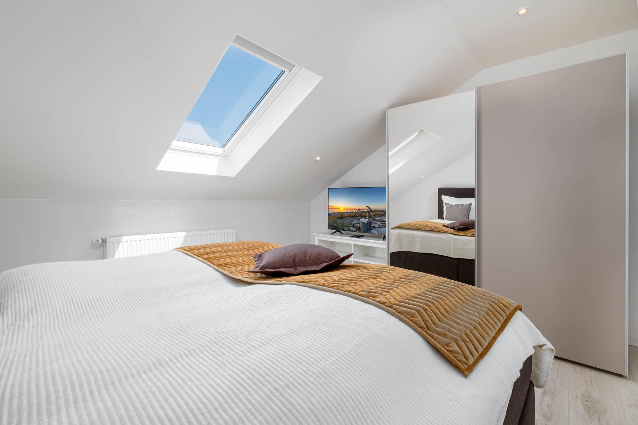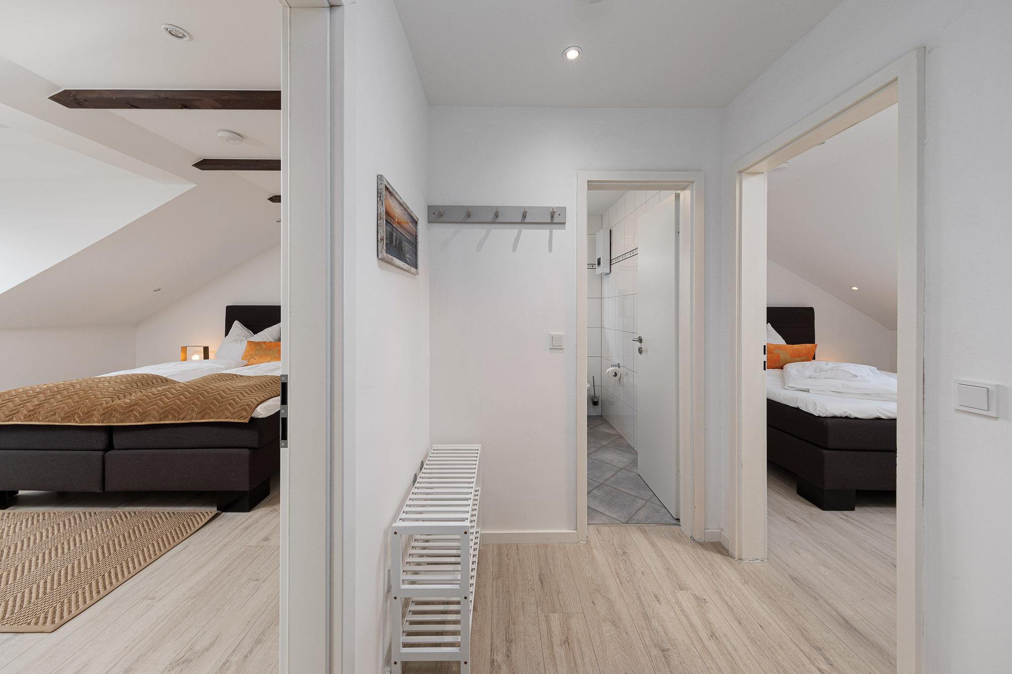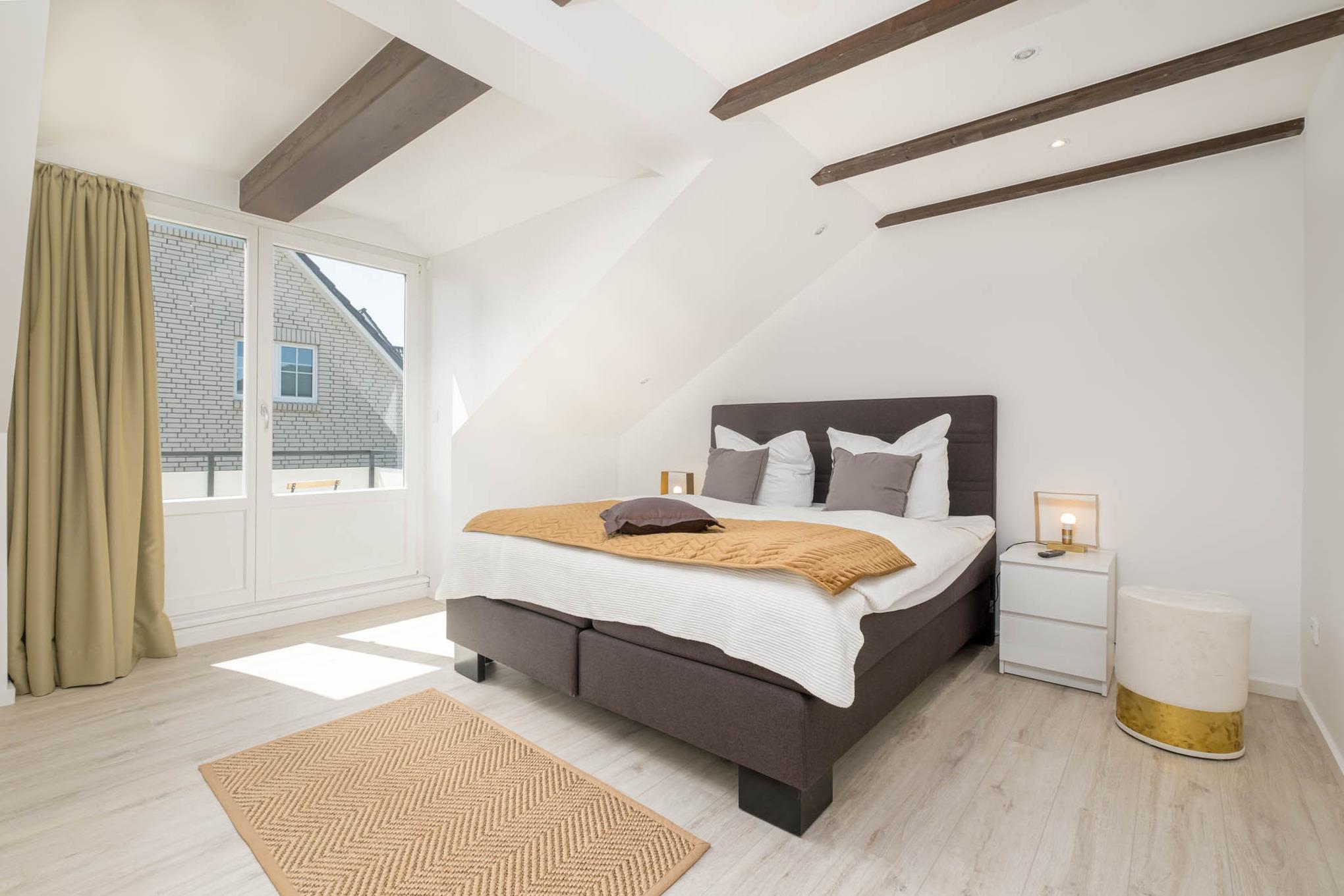 Die zwei Schlafzimmer im ersten OG sind mit sehr hochwertigen Schlaraffia Boxspringbetten mit 180x200cm Liegefläche ausgestattet. Die Betten verfügen jeweils über zwei verschiedene Matratzen mit den Härtegraden (2 und 3), welche durch einen bequemen Kaltschaum-Topper miteinander verbunden sind. Zudem sind die Schlafzimmer jeweils mit einem Flatscreen-TV und einem großen Kleiderschrank ausgestattet. Das größere der beiden Schlafzimmer verfügt darüber hinaus über eine eigene Sitzecke sowie einen Balkon, welcher ebenfalls zur Sonnenseite ausgerichtet ist.