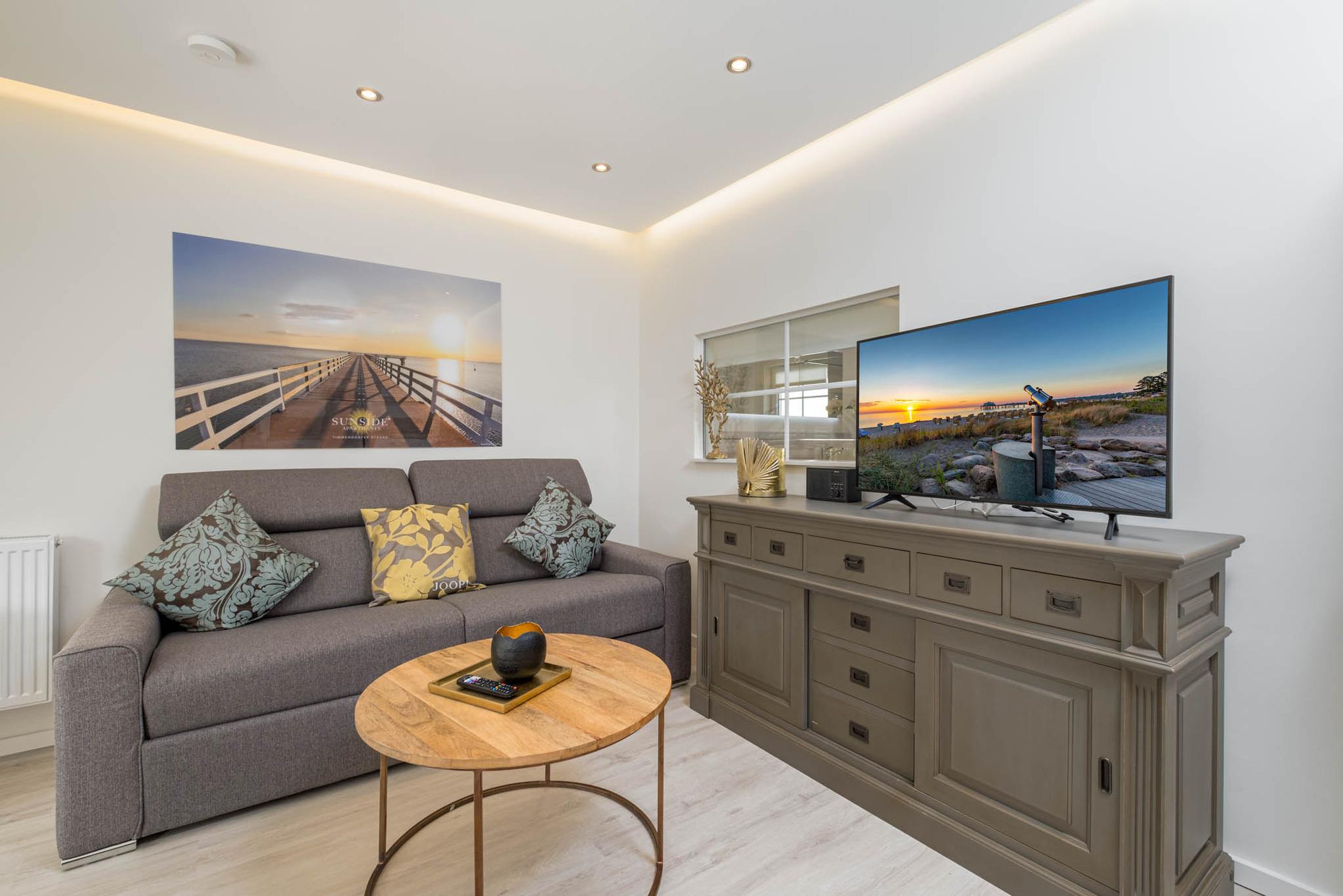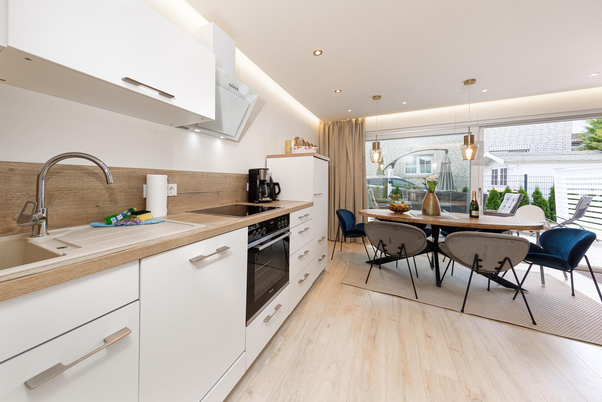 Die offene Küche, ausgestattet mit einem Ceranfeld, einem Backofen, einem Geschirrspüler, einem Kühl- und Gefrierschrank, sowie allen erforderlichen Küchenutensilien grenzt an den ebenfalls offen gestalteten Wohn- und Essbereich an. Das Wohnzimmer verfügt über ein hochwertiges ausziehbares Schlafsofa mit integrierter separater Matratze (Dauerschläfer, 160cm), auf welchem bei Bedarf zwei zusätzliche Personen schlafen können. Weiterhin verfügt das Wohnzimmer über einen großen Esstisch und einen großen Flatscreen-TV (43Zoll) mit integrierten Smart-TV und einer HiFi-Bluetooth Anlage.
