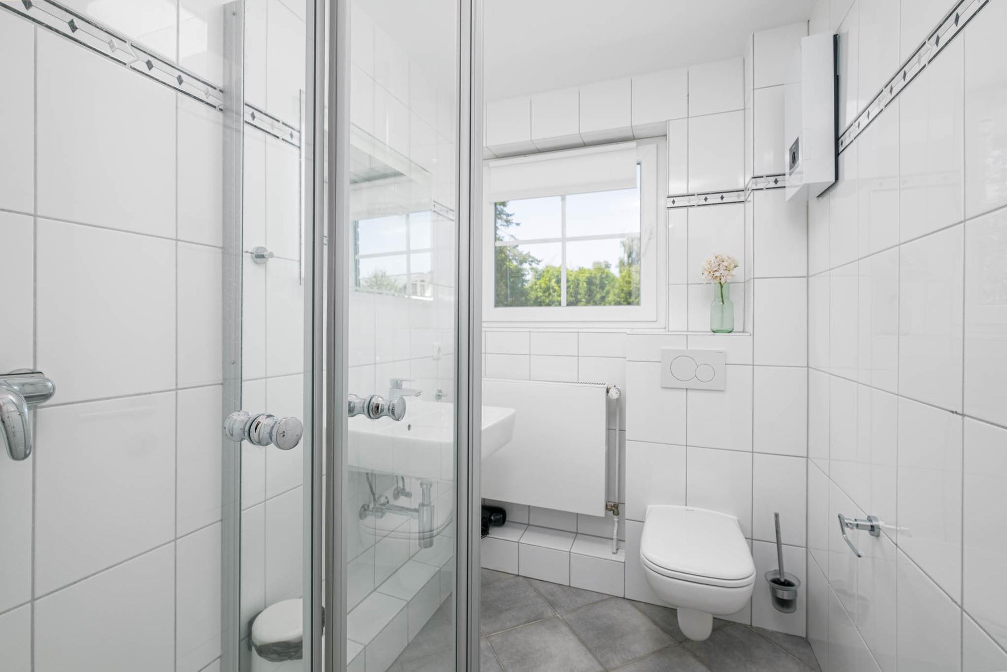 Ein sehr großes und stylisches Bad im Erdgeschoss mit halb-freistehender Badewanne, einer großen offenen Duschkabine inkl. Regendusche, einer Toilette und einem großen Waschtisch mit zwei Waschbecken bietet die perfekte Wohlfühloase für die Gäste. Ein wahrer Hingucker ist das offen gestaltete Fenster mit Blick ins Wohnzimmer und auf die Terrasse. Dieses sorgt für einen super Ausblick aus dem Bad heraus und viel Licht. Es kann wahlweise geöffnet oder geschlossen werden, um die Privatsphäre im Bad zu gewähren. Ein zweites vollausgestattetes Bad mit Dusche findet sich im ersten OG.