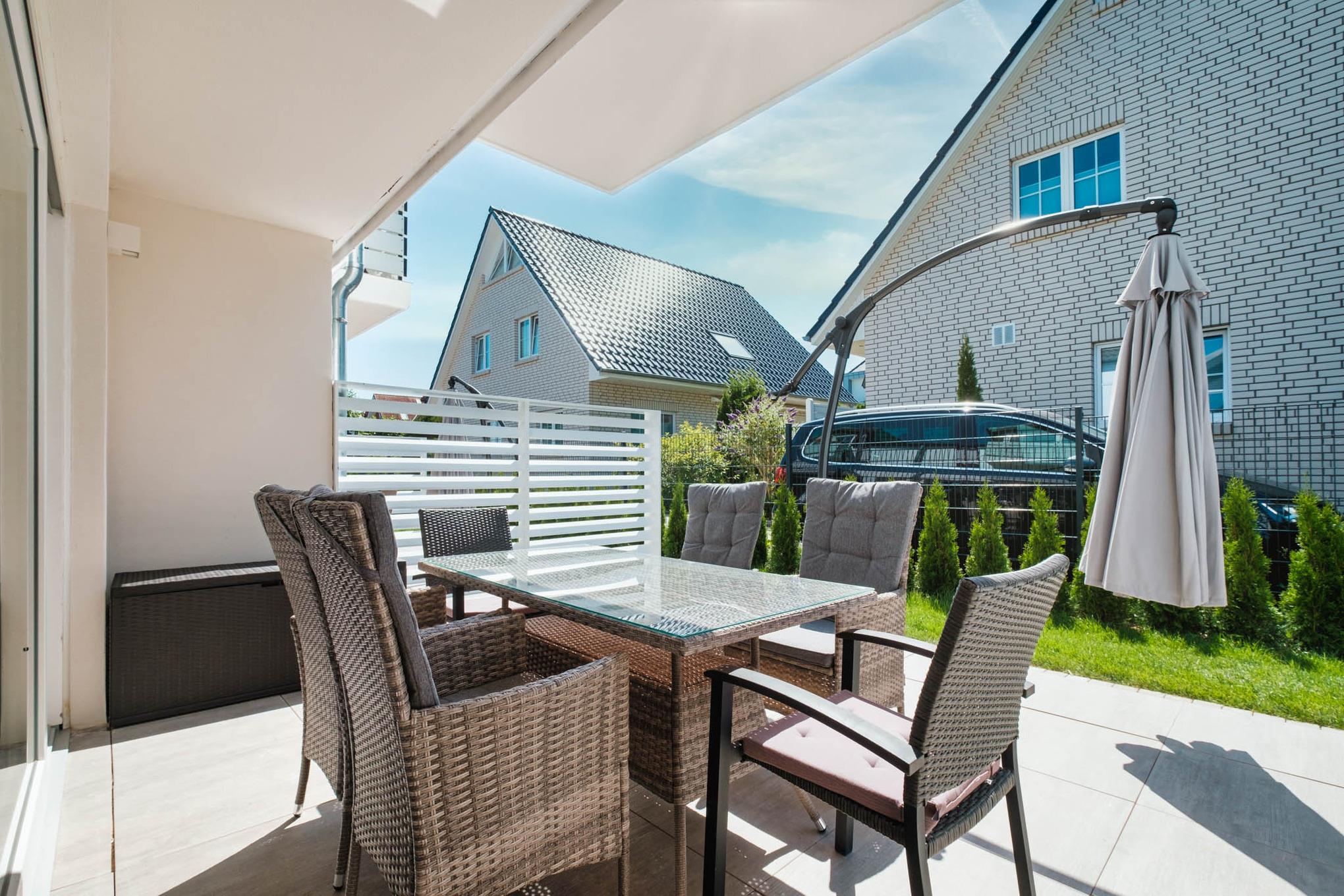 Das Apartment erstreckt sich über zwei Geschosse und bietet neben einer großen Terrasse im Erdgeschoss, einen separaten Balkon im ersten OG. Das Apartment ist durch seine Süd-West Lage von morgens bis zum frühen Abend sonnig gelegen. Es eignet sich ideal für Ihren Urlaub mit der Familie mit Kindern. Bei schönem Wetter lädt die große Terrasse natürlich nicht nur zum Sonnenbaden ein, sondern auch zum gemütlichen Frühstück mit frischen Brötchen oder zu einem rustikalen Grillabend (Grill bitte selbst mitbringen) im Kreise Ihrer Lieben.