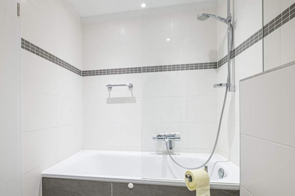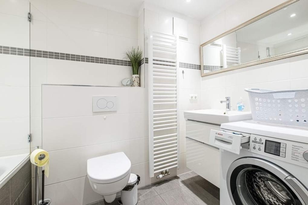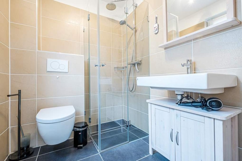 Das Appartement High Five verfügt über ein modernes Bad mit Wanne und Duschfunktion und ein Gäste-WC mit bodengleicher Dusche. Die gesamte Ferienwohnung ist mit einer Fußbodenheizung ausgestattet.