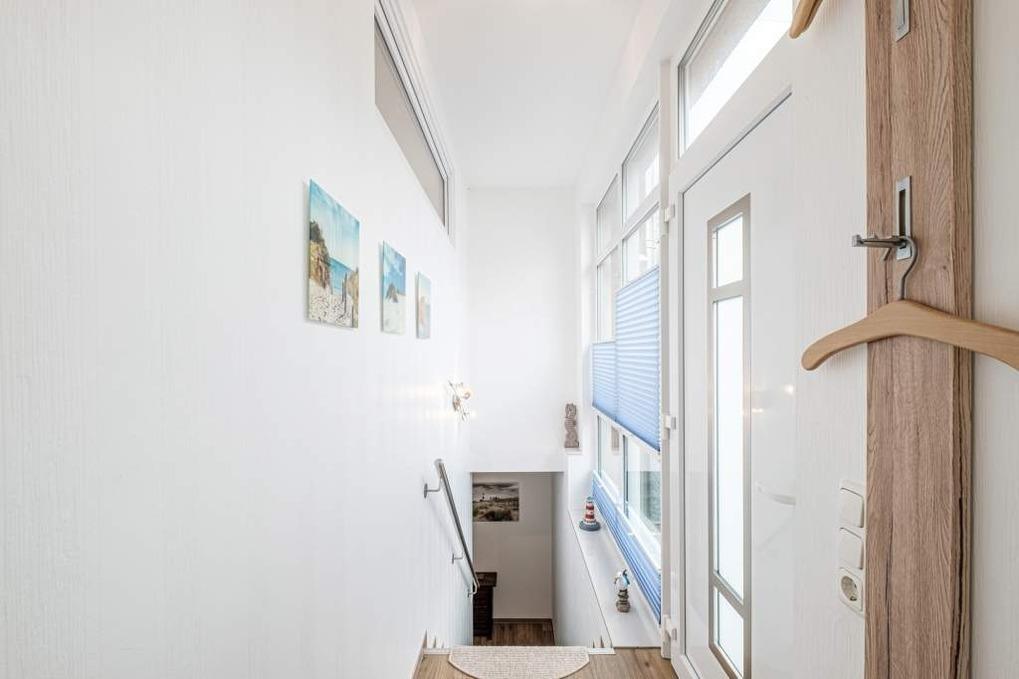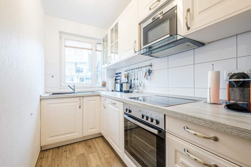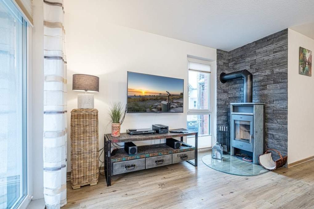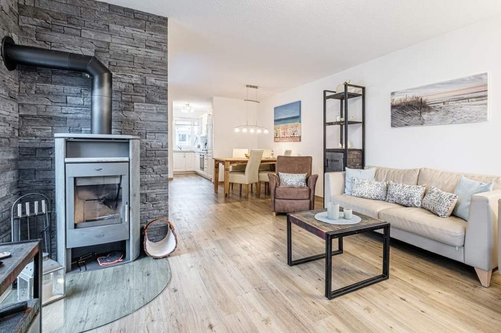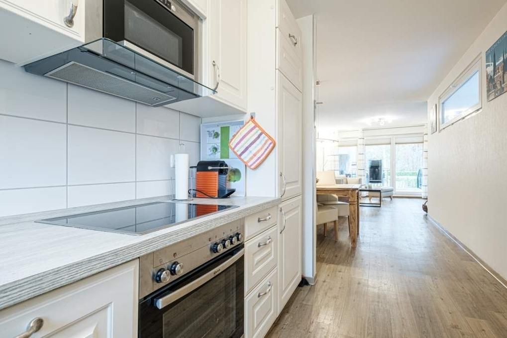 Die Timmendorfer Strand Ferienwohnung geht über 2 Ebenen (Treppe im Flur vom Erdgeschoss ins Untergeschoss) und verfügt über einen Wohnraum mit moderner Couchgarnitur, Kaminofen (das Holz ist selbst zu besorgen), Flatscreen-TV, Blue-ray-Player, Stereo-Anlage und eine Essecke. Die Küche ist separat und mit den modernsten Geräten ausgestattet. Diese ist mit Backofen, Mikrowelle, Geschirrspüler, Cerankochfeld, Filterkaffeemaschine und Nespresso Kaffeemaschine sowie einem Toaster und dem Wasserkocher ausgestattet.