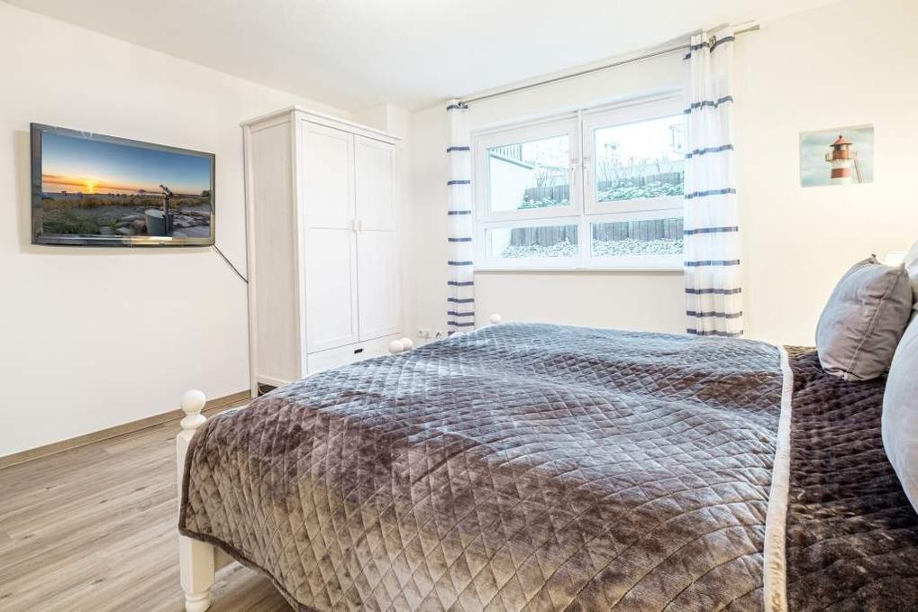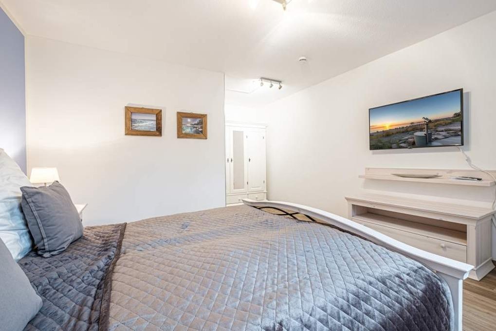 Beide Schlafzimmer dieser Ferienwohnung befinden sich im Untergeschoss und sind mit einem Doppelbett (180x200cm) bzw. 2 Einzelbetten (90x200cm) eingerichtet. In jedem der Schlafzimmer befindet sich ein zusätzlicher Flatscreen-TV. Beide Schlafzimmer lassen sich durch elektrische Außenjalousien komplett verdunkeln.