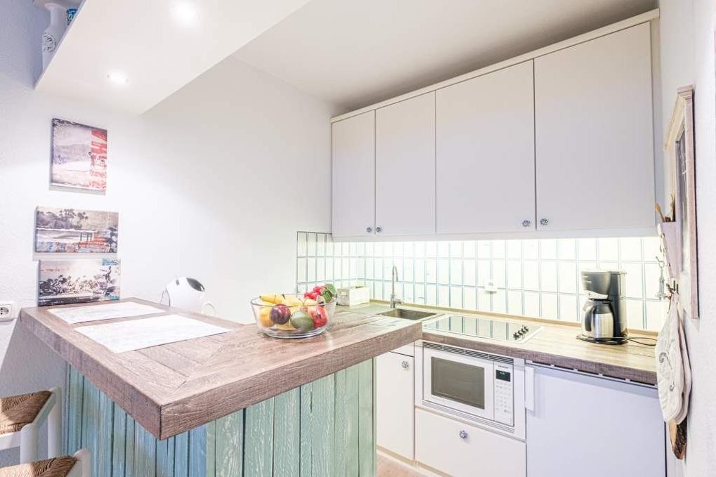 Von dieser liebevoll eingerichteten Timmendorfer Strand Ferienwohnung können Sie einen tollen Meerblick genießen. Es erwartet Sie ein modernes Wohn-Schlafzimmer mit einer Schlafcouch für eine Person, Flatscreen-TV, Stereo-Anlage und Essecke. Die offene Einbauküche der Timmendorfer Strand Ferienwohnung ist mit Induktionskochfeld und Mikrowellenbackofen ausgestattet. Das separate Schlafzimmer verfügt über ein gemütliches Doppelbett (Zugang über das Fußende, Maße: 180x200cm).