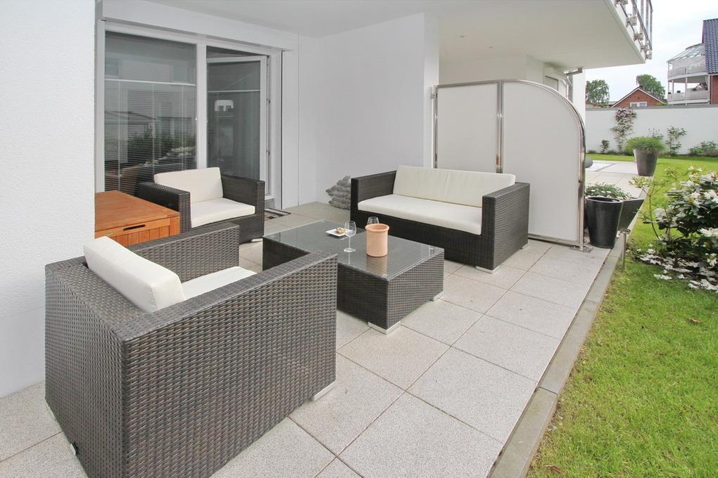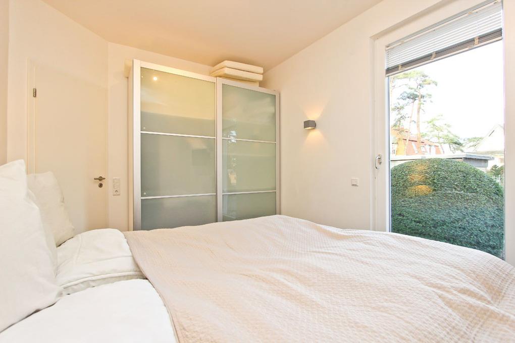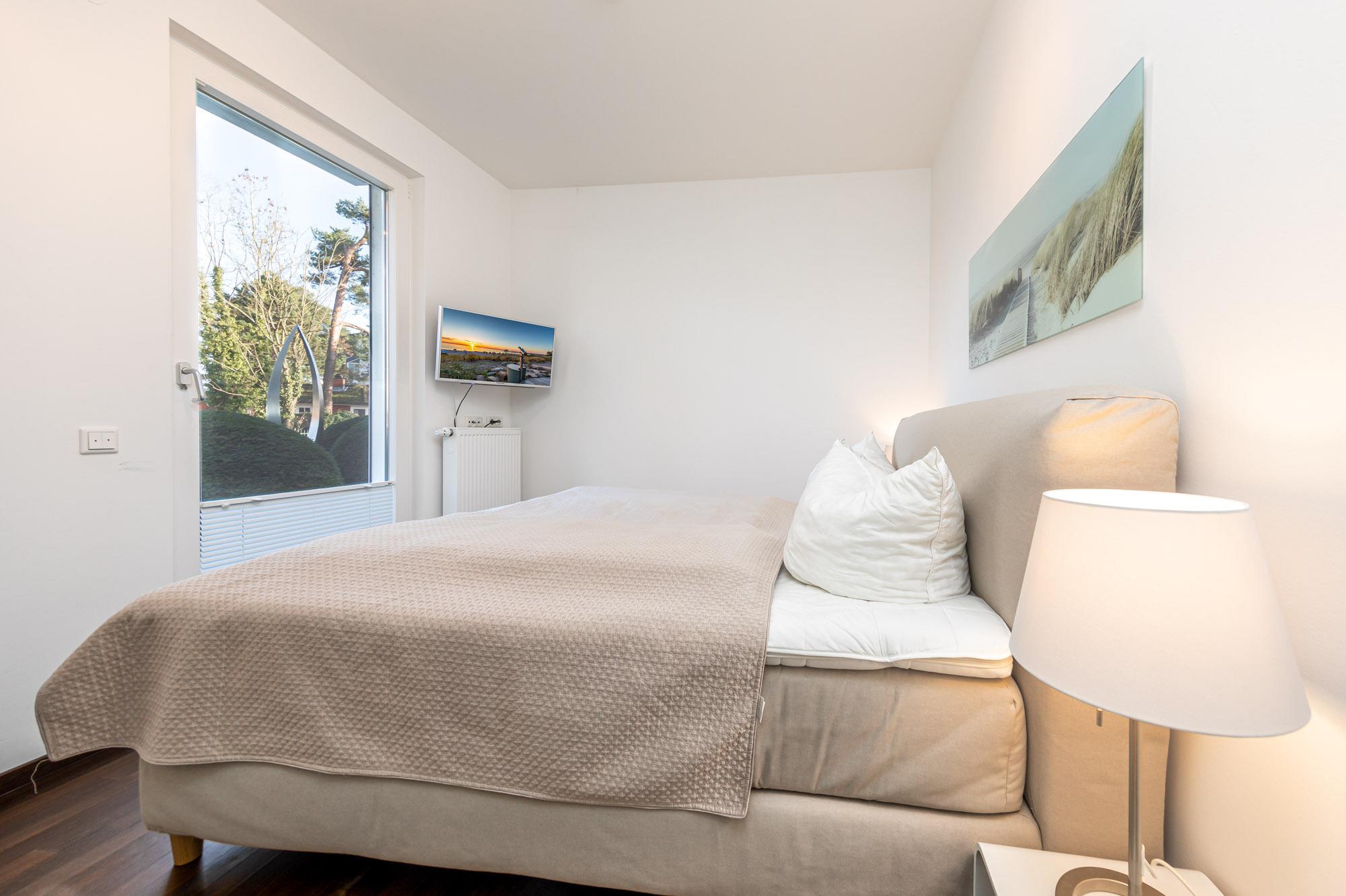 Das Schlafzimmer ist mit einem Boxspringbett (180x200cm), einem zusätzlichen Flatscreen-TV sowie einem Kleiderschrank eingerichtet. Um Ihnen einen erholsamen Schlaf zu garantieren, lassen sich die Schlafräume der Ferienwohnung verdunkeln. Das Badezimmer ist mit einer großen Dusche und Waschtisch ausgestattet. Die möblierte Terrasse in Nord-Lage mit Loungebereich und Strandkorb und der angrenzende Garten runden dieses traumhafte Urlaubsdomizil im Herzen von Timmendorfer Strand ab.