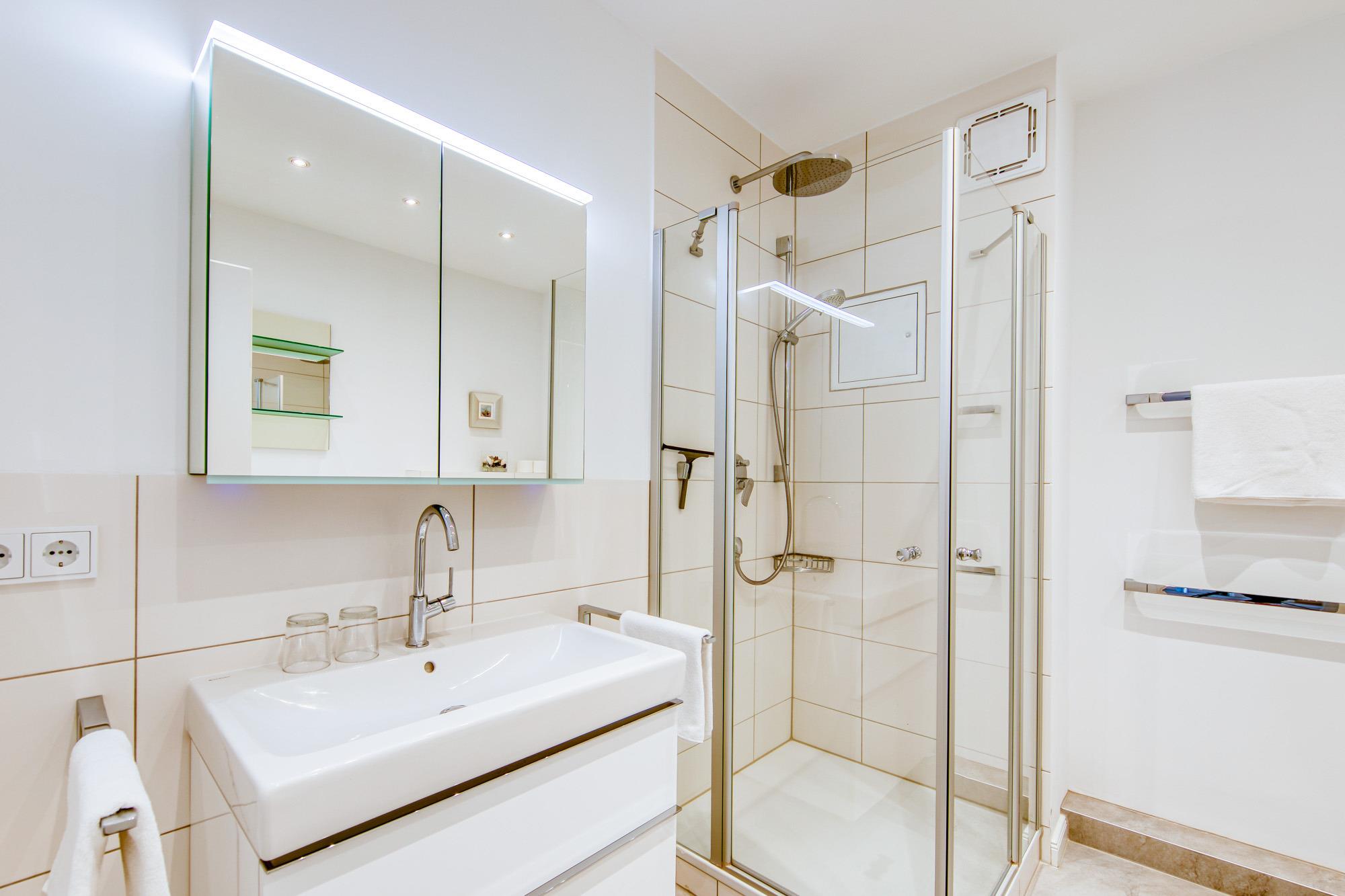 Das Eltern Schlafzimmer ist mit einem Doppelbett (180x200cm) ausgestattet, zudem befindet sich ein 2. Fernseher und ein großer Kleiderschrank in diesem Raum. In diesem Urlaubsdomizil finden Sie ein Badezimmer mit Dusche vor, auch befinden sich dort eine Waschmaschine und ein Trockner zur alleinigen Nutzung. Zusätzlich gibt es ein Gäste-WC.