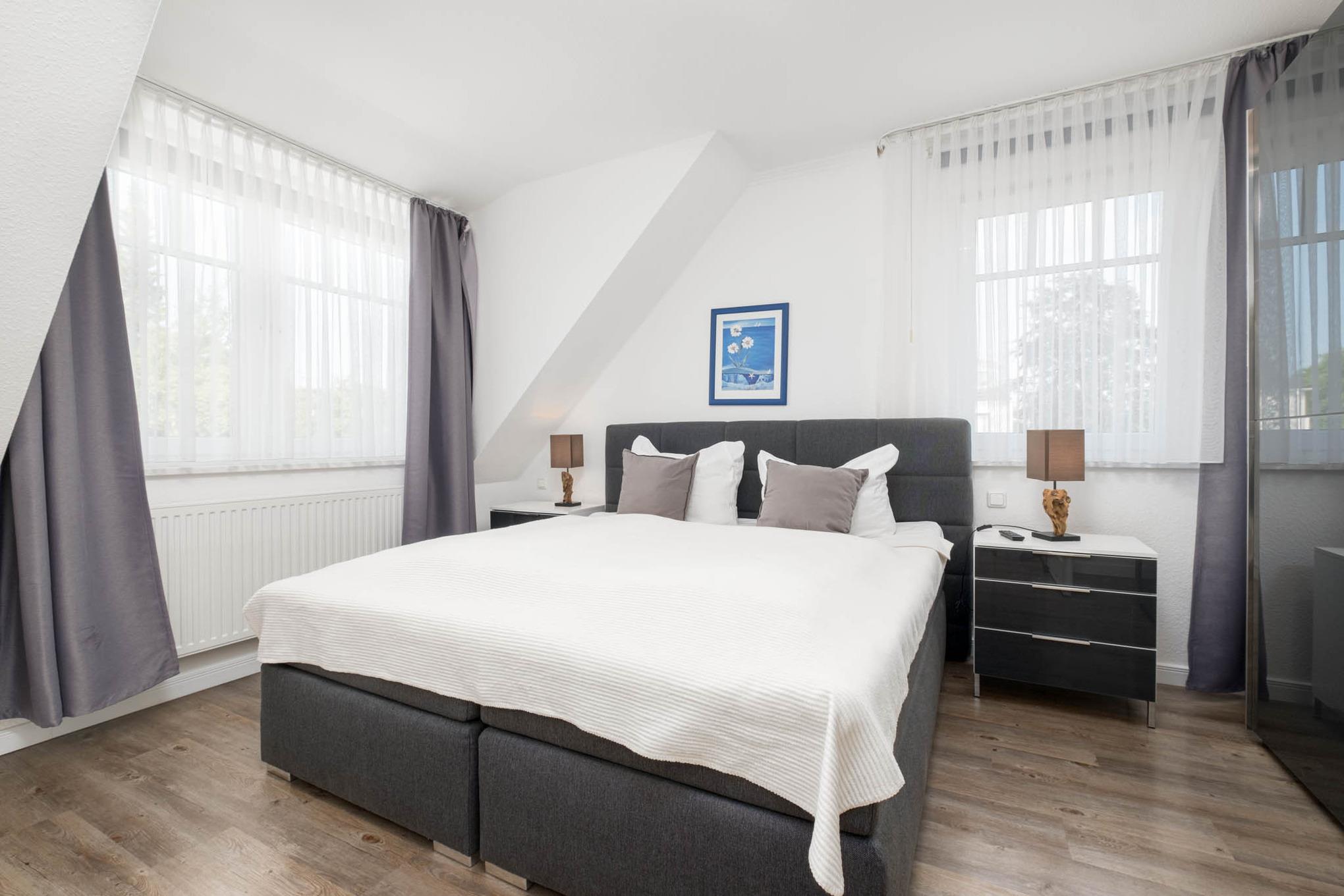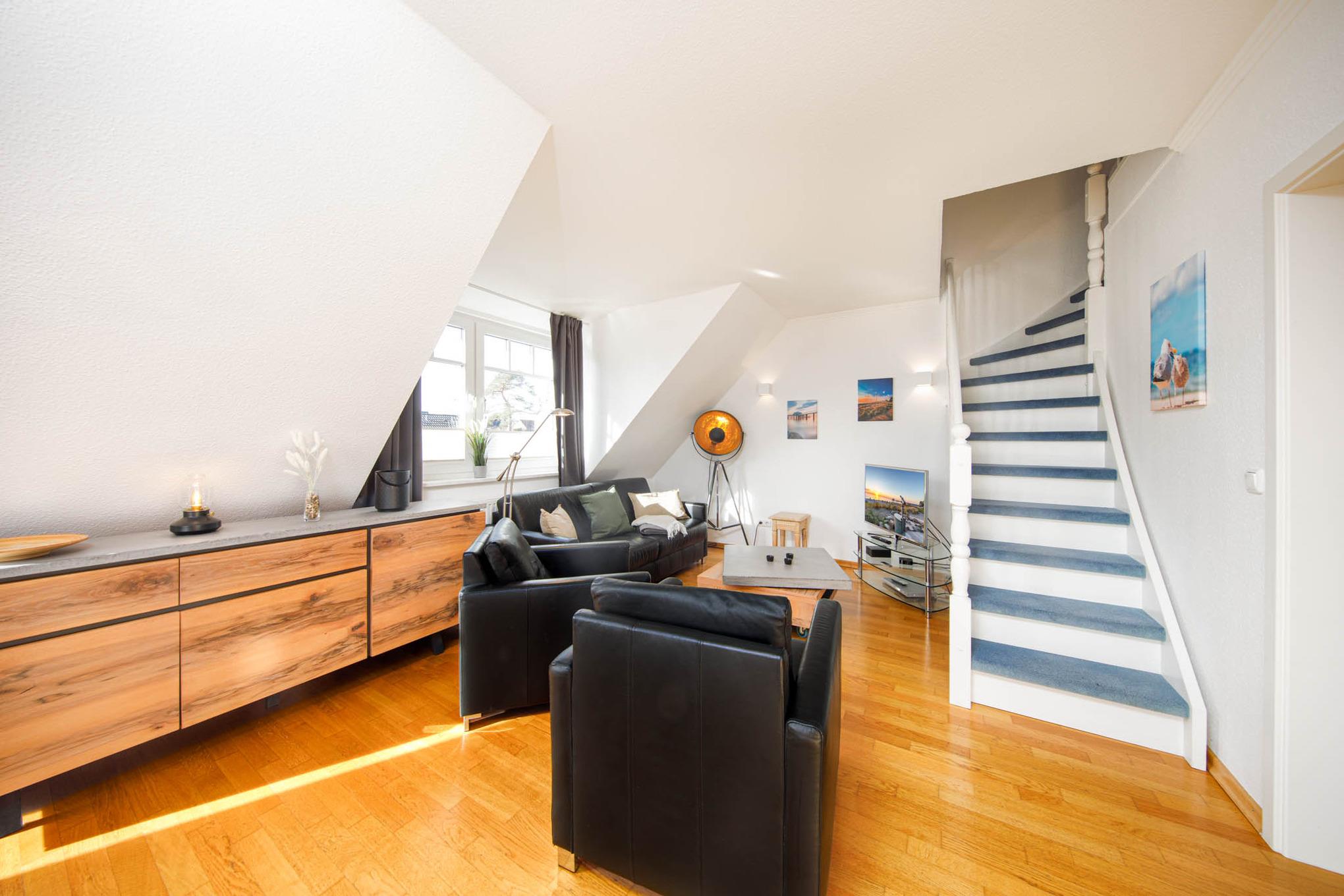 Bei der Ferienwohnung Timmendorfer Strand Nr. 9 handelt es sich um ein schönes 3-Zimmer-Appartement in der 1. Etage mit möbliertem Balkon in Süd-West-Ausrichtung mit Markise und Parkettfußboden im Wohnbereich. Das Appartement erstreckt sich über 2 Ebenen auf eine Wohnfläche von 75qm und ist für 4 Personen geeignet. Die Timmendorfer Strand Ferienwohnung verfügt über einen Wohnbereich mit Leder-Couchgarnitur, Flat Screen TV, Apple TV und Bose SoundTouch Anlage sowie einer gemütlichen Essecke. Die offene, angrenzende Pinienholz-Einbauküche verfügt über Ceranfeld, Backofen, Mikrowelle und Geschirrspüler. Zudem sind alle weiteren, notwendigen Küchenutensilien vorhanden. Das Schlafzimmer I ist mit einem komfortablen Doppelbett (180x200cm) ausgestattet. Das Schlafzimmer II befindet sich auf der 2. Ebene, die über eine Treppe im Wohnzimmer zu erreichen ist. Hier stehen Ihnen 2 Einzelbetten (90x200cm) zur Verfügung. Darüber hinaus ist jedes Schlafzimmer mit einem zusätzlichen Flat Screen TV ausgestattet. Ein Bad mit ebenerdiger Dusche und Bidet ist vorhanden. Ebenfalls ein Gäste-WC, welches sich auf der 2. Ebene beim zweiten Schlafraum befindet.