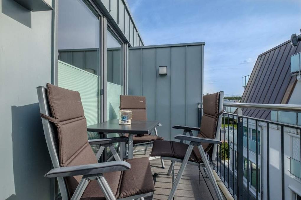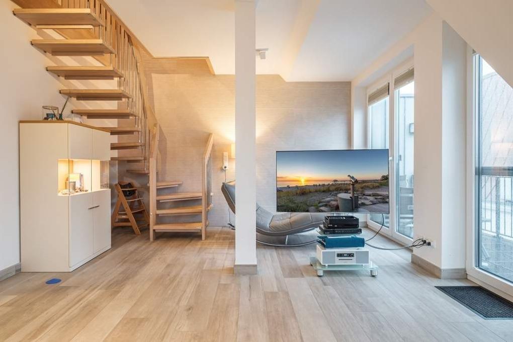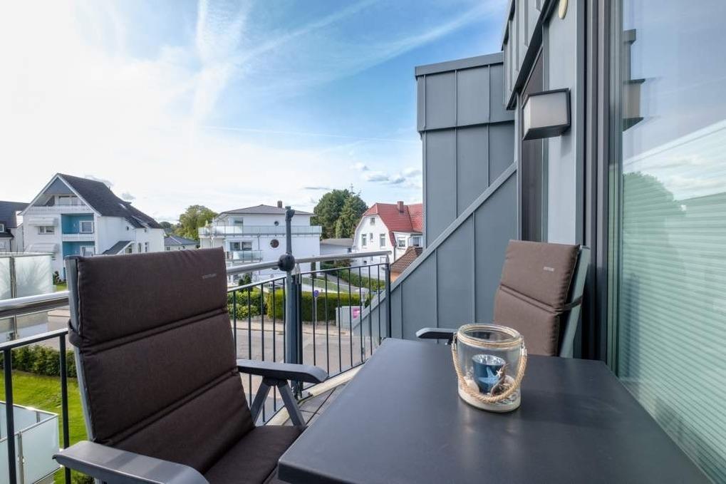Ein möblierter Süd-/Westbalkon mit schönem Blick über die Dächer von Timmendorfer Strand, Nachmittag- und Abendsonne, großzügige Fenster, vollkeramischer Fußbodenbelag im gemütlichen Holzdekor mit Fußbodenheizung in der unteren Etage sorgen für ein gemütliches Ambiente.