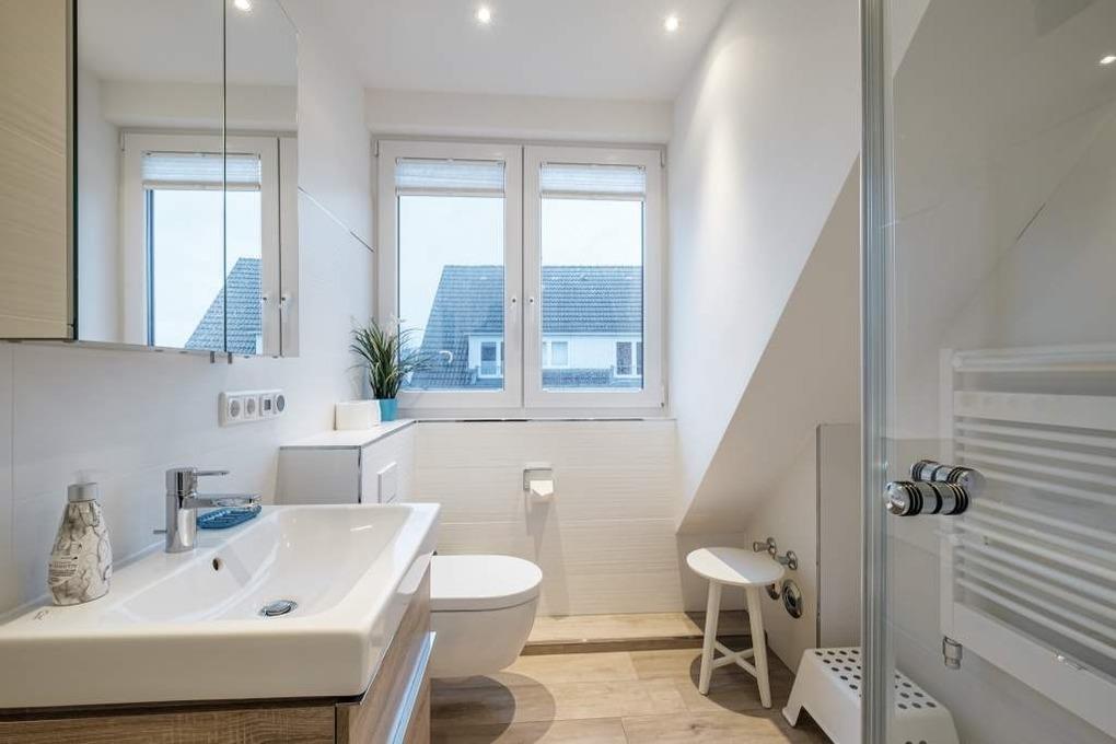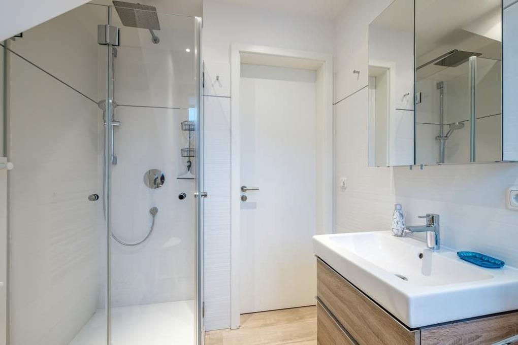 Das hochwertig eingerichtete Bad der Ferienwohnung lädt durch die vorhandene Regenschauerdusche und das Einbau-Radio zum Verweilen ein.