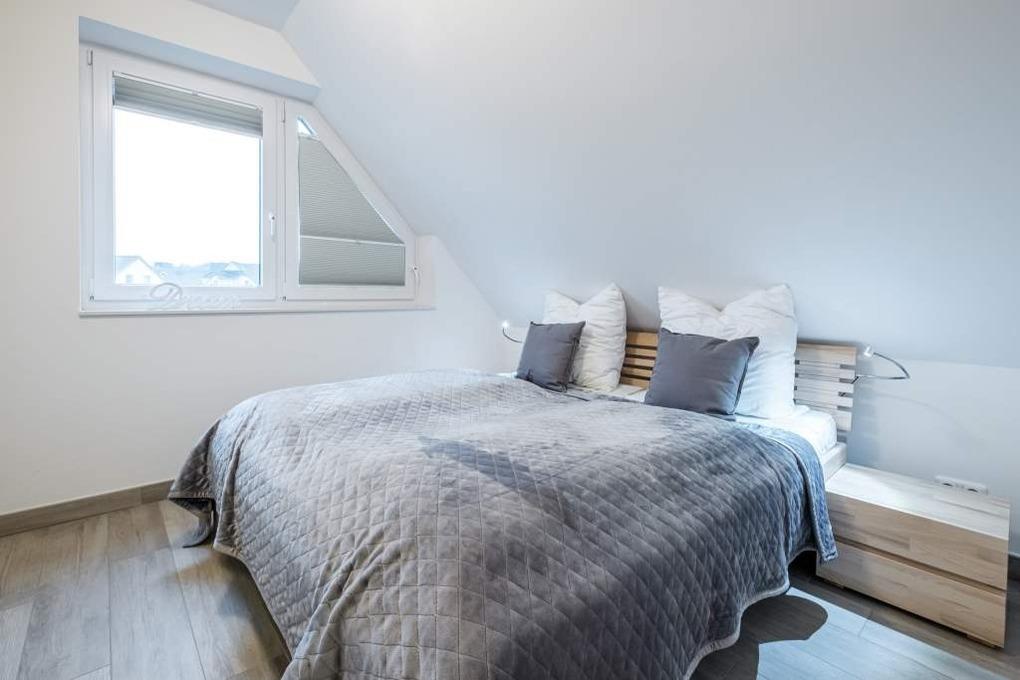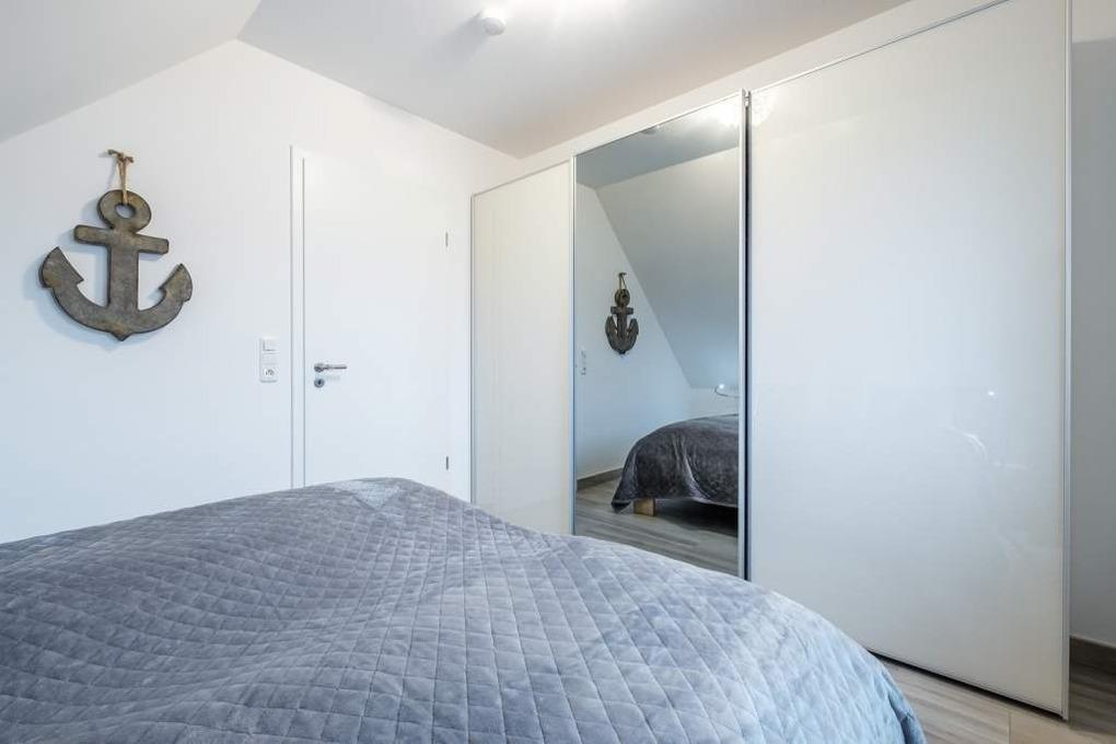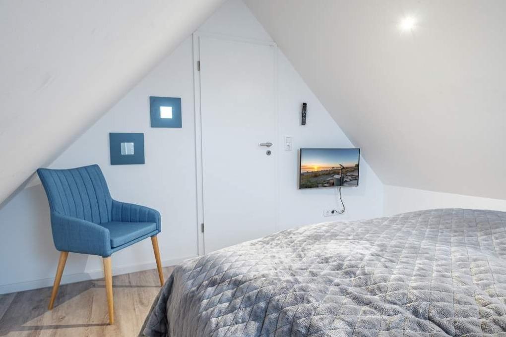 Das 2. separate Schlafzimmer liegt auf der oberen Ebene und ist ebenfalls mit einem Doppelbett (180x200cm) und einem Einbauschrank eingerichtet. Hier befindet sich ein baugleicher, etwas kleinerer 2. Flatscreen-TV.