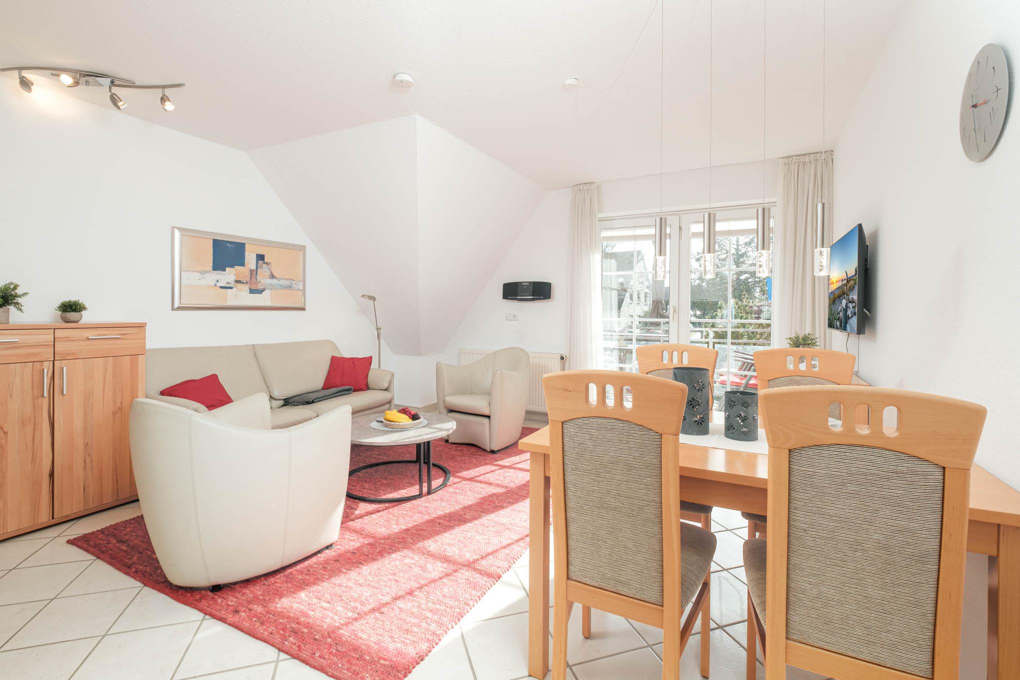 Ein möblierter Balkon in Süd-West-Lage, welcher vom Wohnzimmer aus zugänglich ist, rundet dieses gemütliche und familienfreundliche Urlaubsdomizil an der Ostsee ab.
