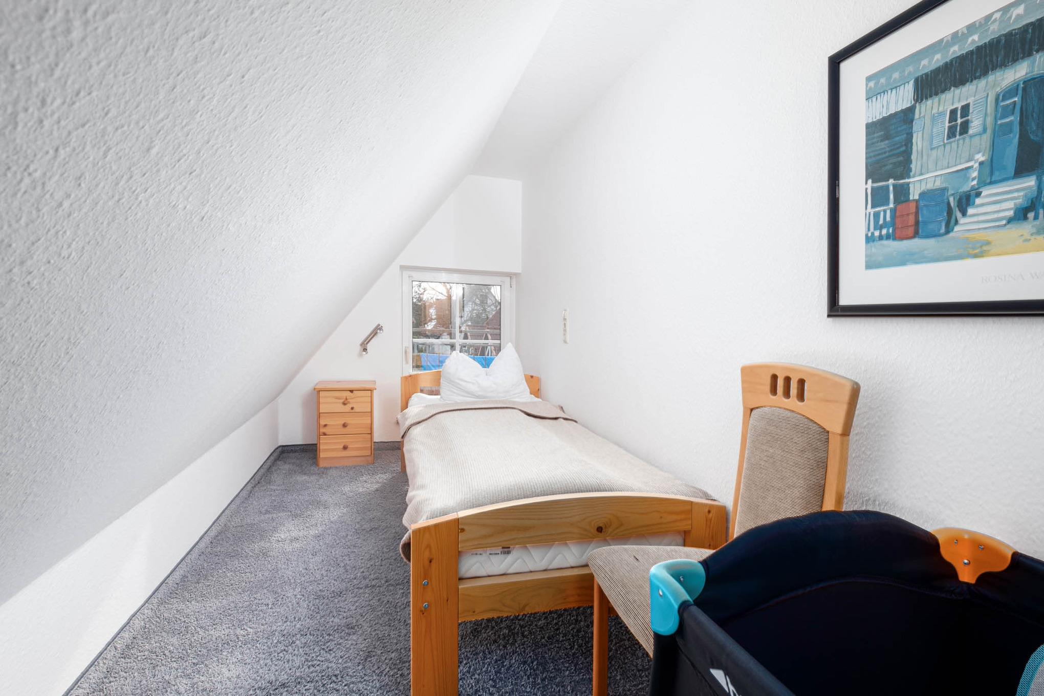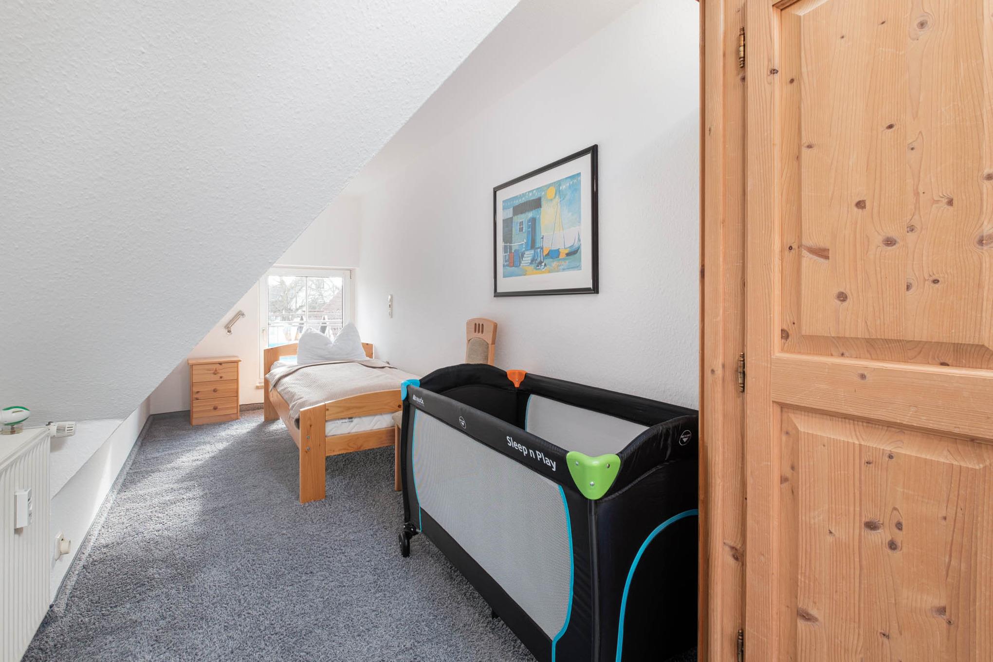 Das zweite Schlafzimmer dieser Ferienwohnung Timmendorfer Strand ist mit 2 Einzelbetten ausgestattet, liegt auf einer 2. Ebene und verfügt über ein eigenes Duschbad und einen 2. Flatscreen-TV. Sie erreichen dieses Schlafzimmer über eine Treppe aus dem Wohnzimmer. Der obere Schlafraum ist offen zur Treppe.