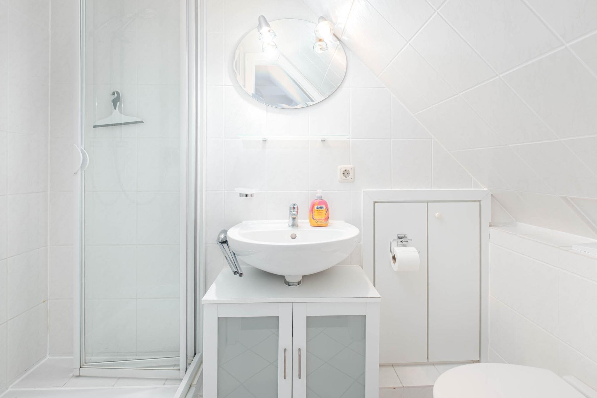 Ein Schlafzimmer mit Doppelbett (180x200cm) befindet sich auf dieser Ebene, ebenfalls ein Badezimmer mit Dusche.