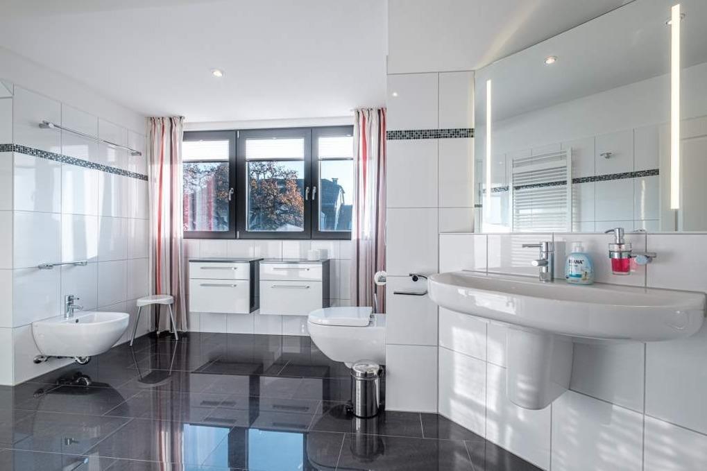 Das große Wohnzimmer verfügt über eine moderne Leder-Couchgarnitur, ein Wandklappbett für 1 Person, Flachbild-TV und Stereo-Anlage. Die offene, in den Wohnraum integrierte Einbauküche ist mit Ceranfeld, Backofen, Mikrowelle und Geschirrspüler sowie einer gemütlichen Essecke ausgestattet.