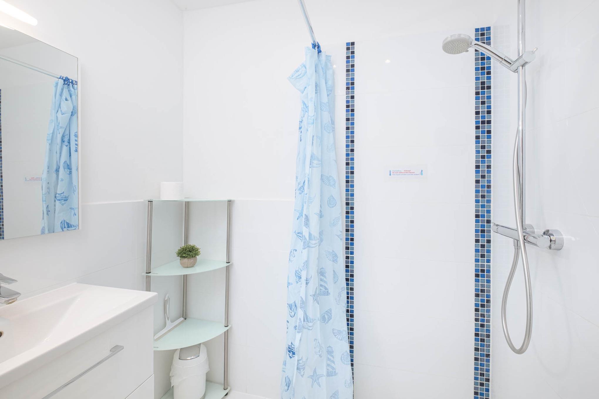 Das Badezimmer verfügt über eine ebenerdige Regendusche.