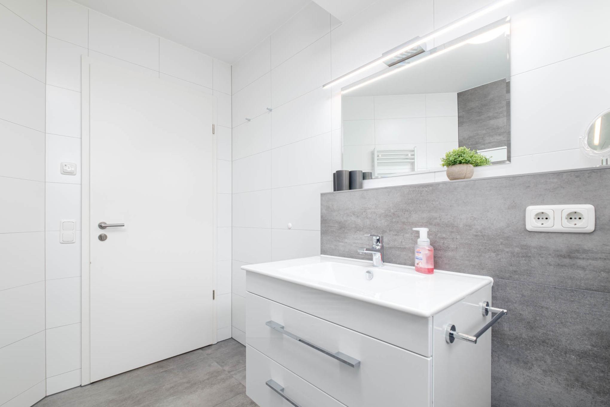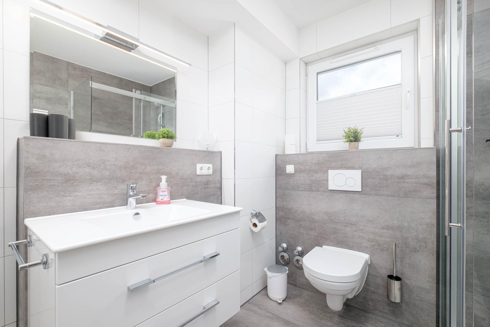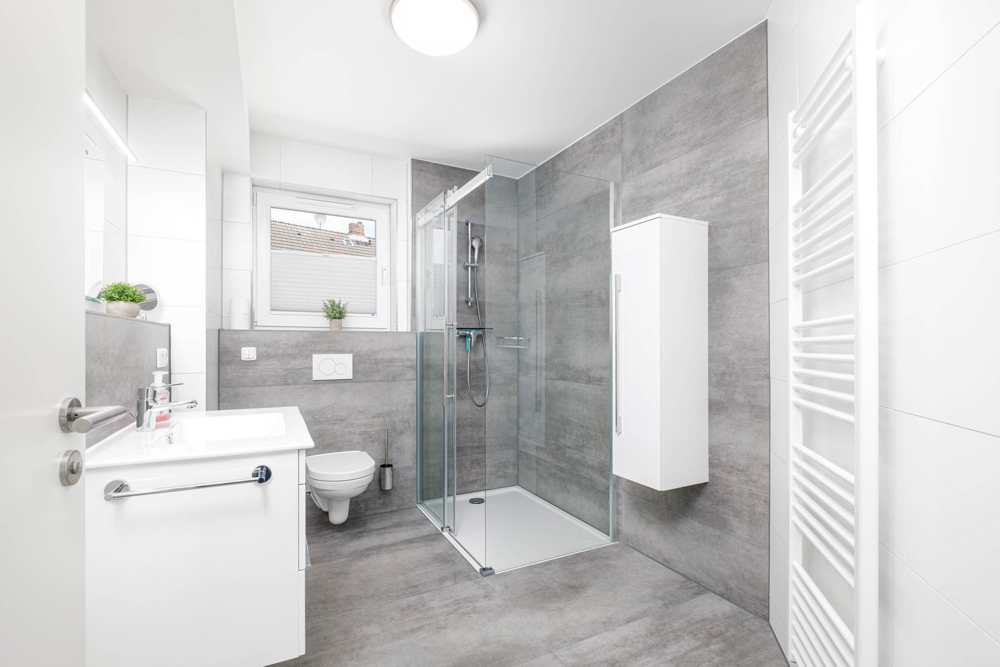 Das Bad ist mit einer modernen Dusche eingerichtet. Ein sonniger Balkon in Süd-/Ostlage mit hochwertigen Gartenmöbeln lädt zum Verweilen und Sonnenbaden ein.