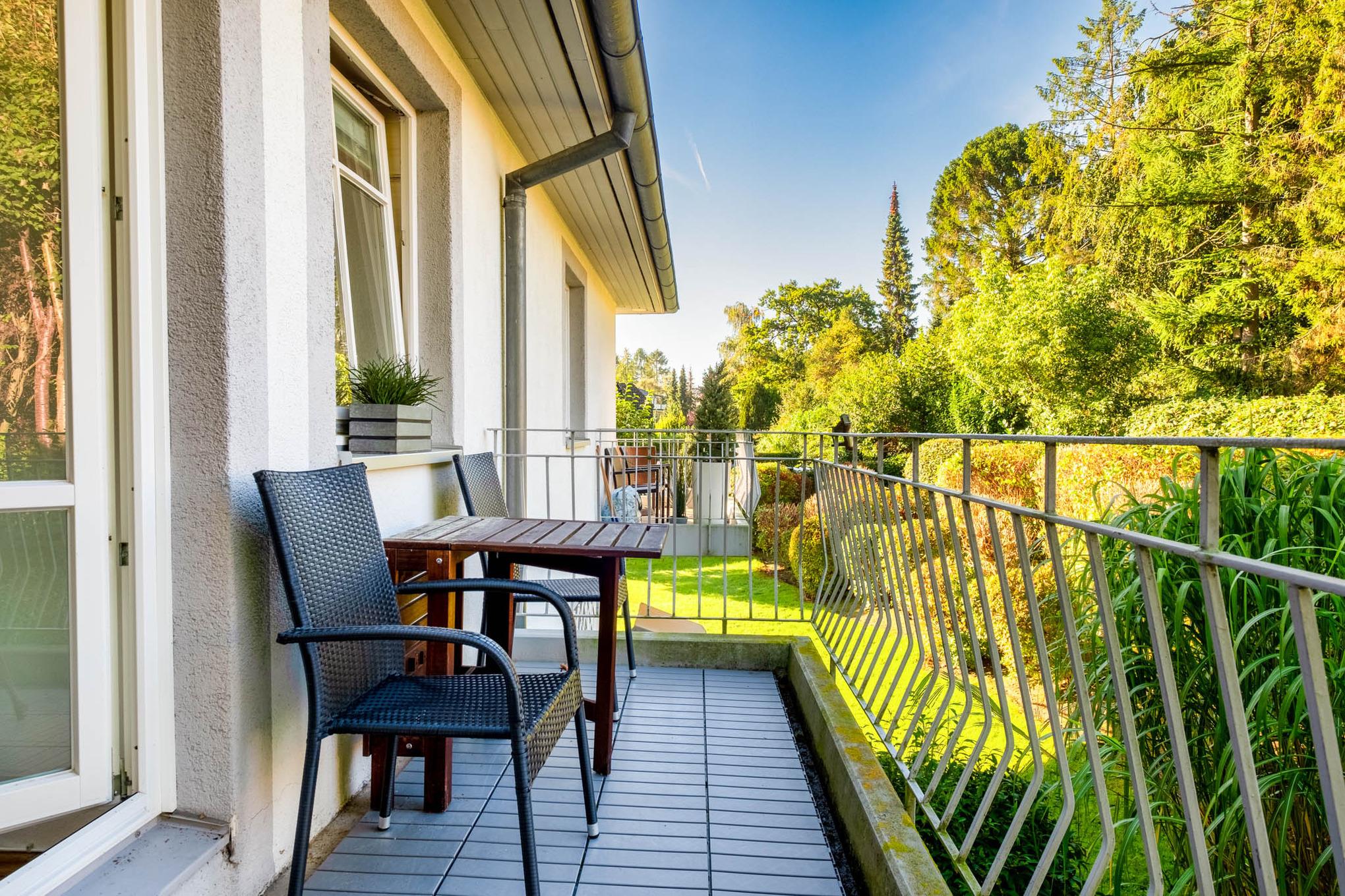 Der möblierte Balkon in Süd-West-Lage mit Strandkorb und Ausblick ins Grüne rundet dieses schöne Appartement ab.