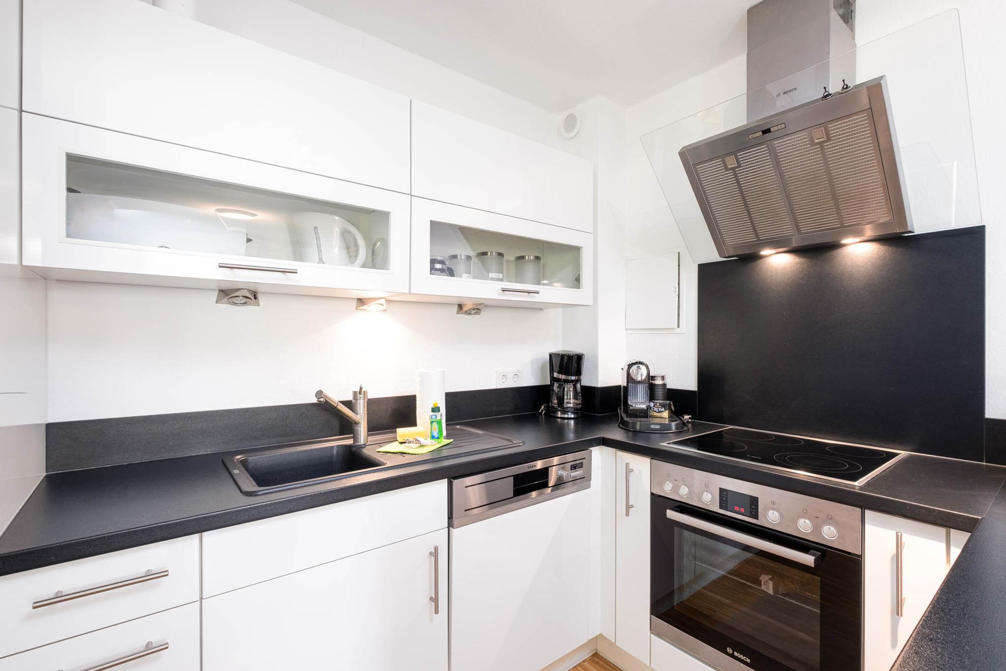 Das Wohnzimmer verfügt über eine moderne Ausziehcouch (120x200cm), einen Flatscreen-TV, sowie einen Essbereich. Die angrenzende Küche ist mit den modernsten Geräten ausgestattet u.a. mit Backofen, Ceranfeld, Geschirrspüler, Nespresso-Kaffeemaschine und Mikrowelle.