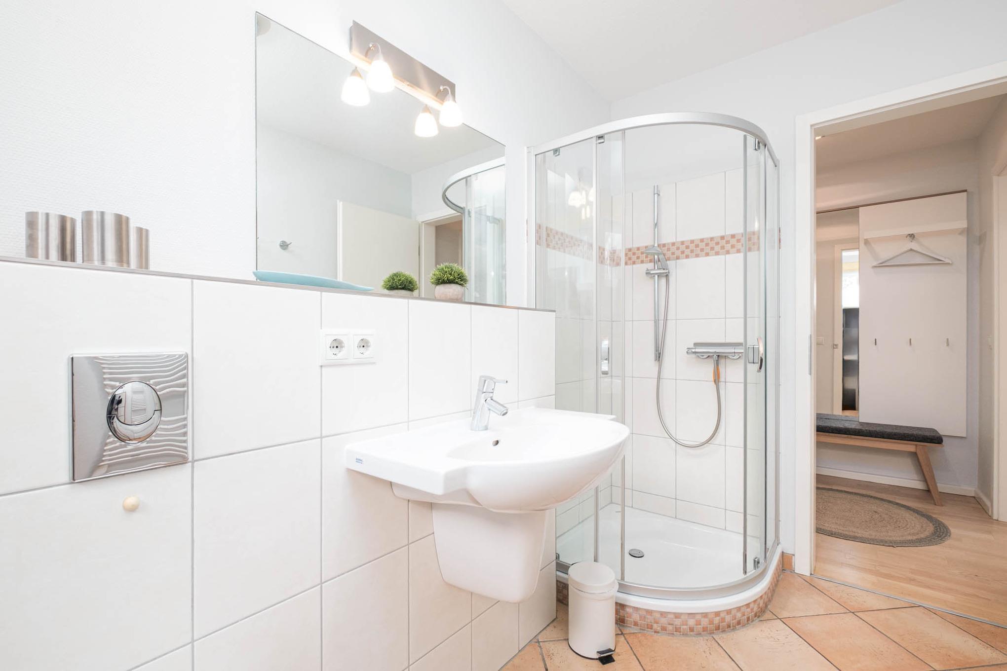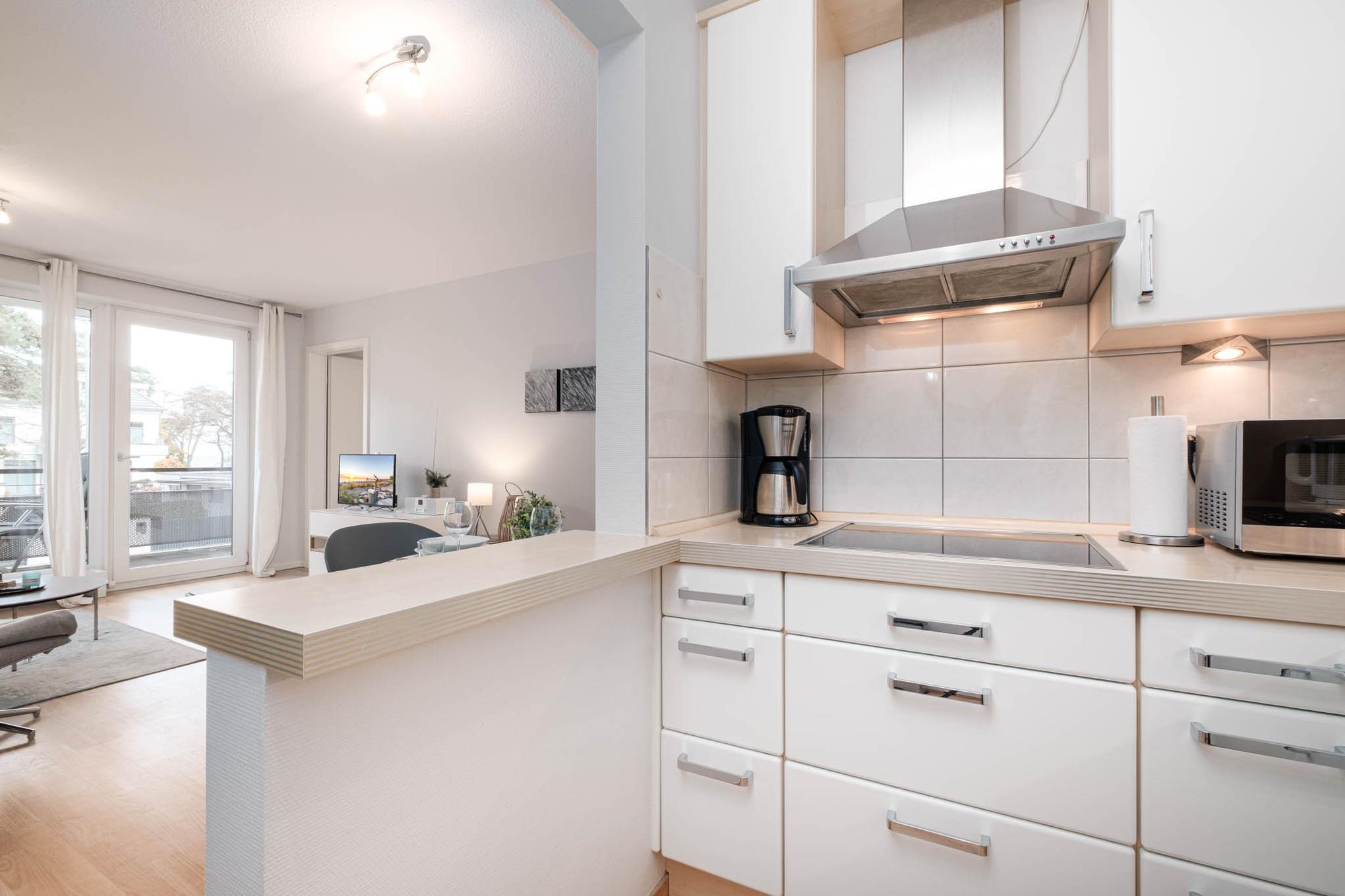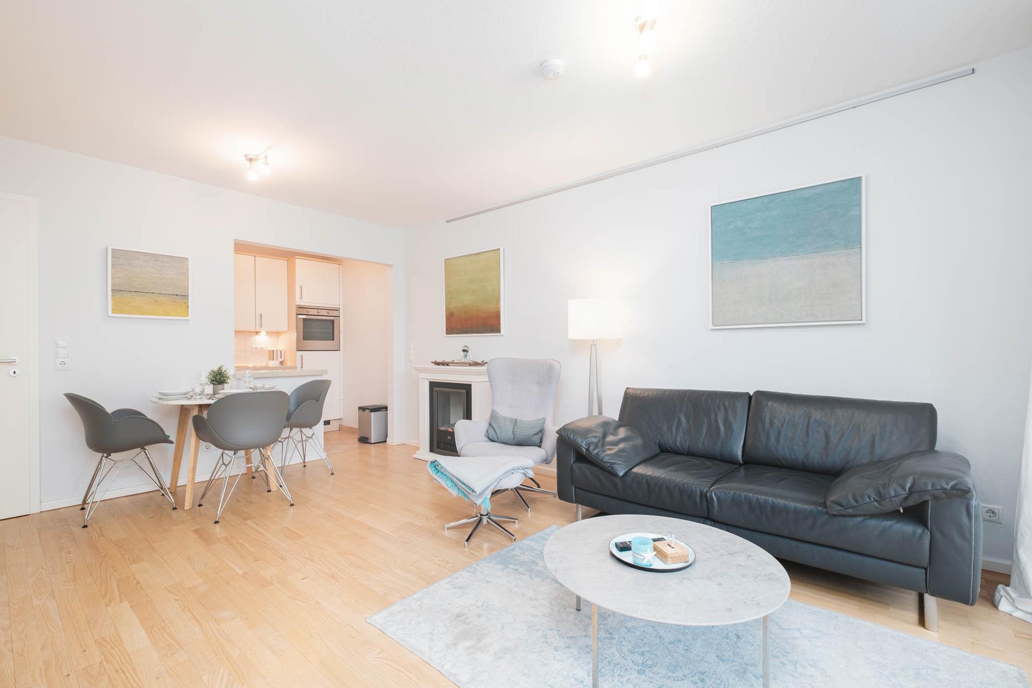 Das geschmackvolle Appartement verfügt über ein Wohnzimmer mit Couchgarnitur, Flachbild-TV und eine gemütliche Essecke. Die offene Einbauküche ist mit Ceranfeld, Backofen, Mikrowelle und Geschirrspüler ausgestattet. Ein modernes Duschbad und eine geschmackvoll eingerichtete Diele sind vorhanden.