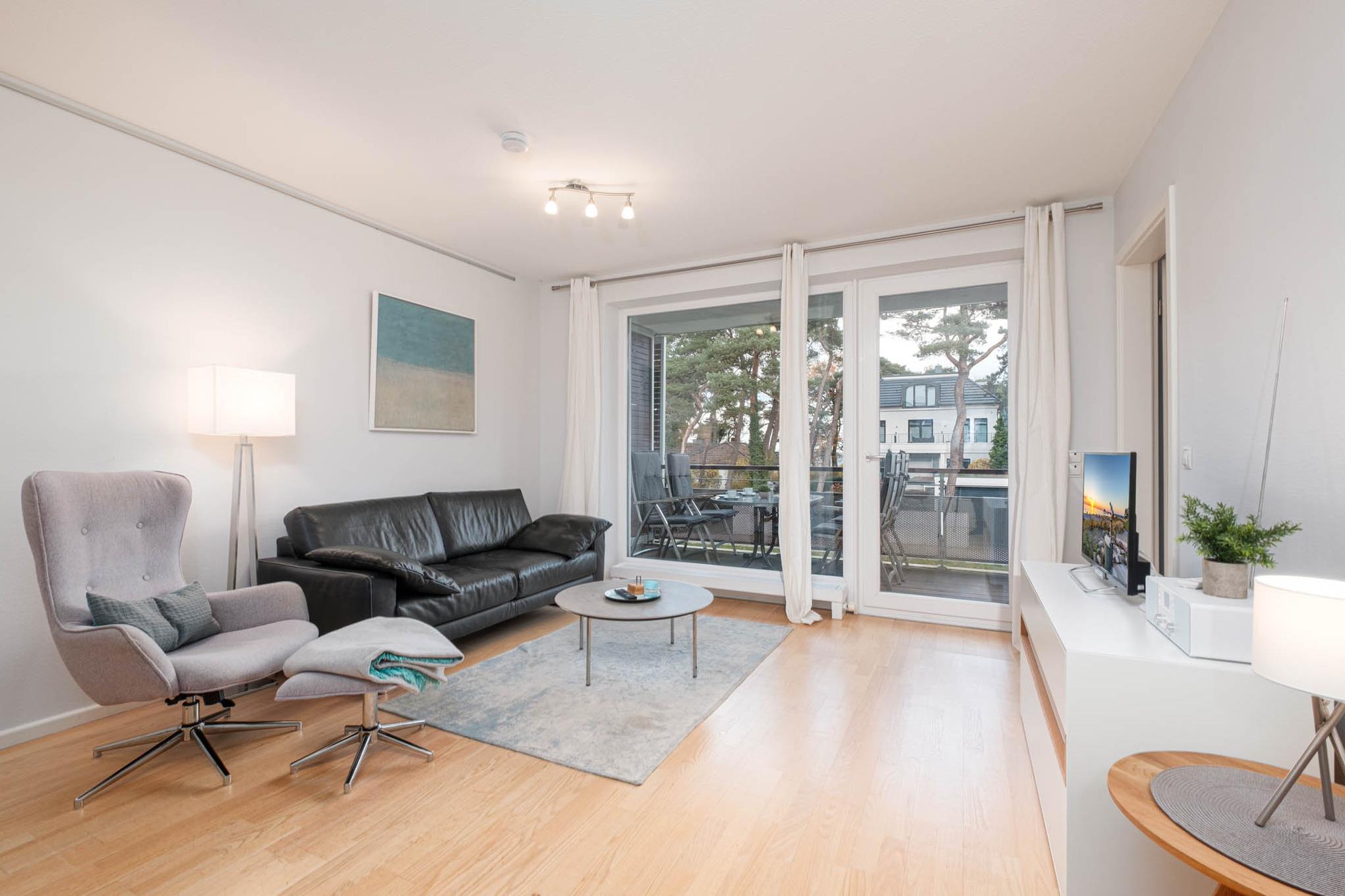 Die moderne 3-Zimmer Timmendorfer Strand Ferienwohnung befindet sich in der 1. Etage mit Balkon und ist für maximal 3 Personen ausgestattet.