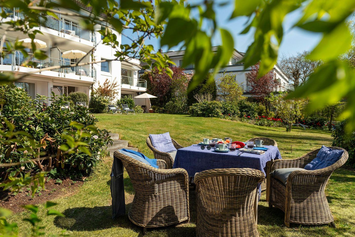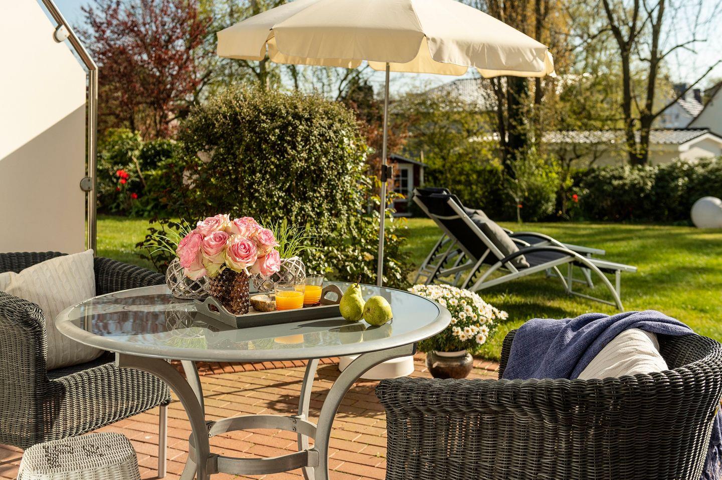 Der Wohnbereich besticht durch ein gemütliches Sofa, geschmackvolles Mobiliar im Beach-House-Stil sowie einen Flachbild-TV. Helle Farben, bodentiefe Fenster und der Blick in den ruhigen Garten schaffen eine harmonische Wohlfühlatmosphäre. Auf der privaten Terrasse können Sie entspannen und den idyllischen Garten genießen. Der weitläufige Gemeinschaftsgarten mit bequemen Liegen bietet zudem viel Platz zum Abschalten und Erholen.