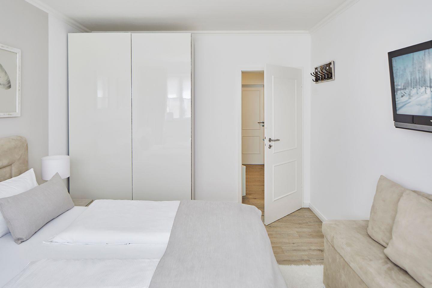 Das Wohnzimmer beinhaltet ein cremefarbenes Sofa und Sessel sowie neueste Smart-TV-Technik mit WLAN. In der separaten Küche können Sie schlemmen, kochen und sich Snacks für einen schönen Strandtag mit zeitgemäßem Küchenequipment zubereiten. Das ruhige Hauptschlafzimmer verfügt über ein hochwertiges Boxspringbett, verdunkelbare Gardinen und einen zweiten TV. Das zweite, kleine Schlafzimmer lädt mit zwei Einzelbetten zum Träumen ein. Das Bad mit Fenster wurde 2021 saniert und verfügt nun unter anderem über eine neue, große Dusche in einem schönen Ambiente. Eine Terrasse oder Austritt ist nicht vorhanden.