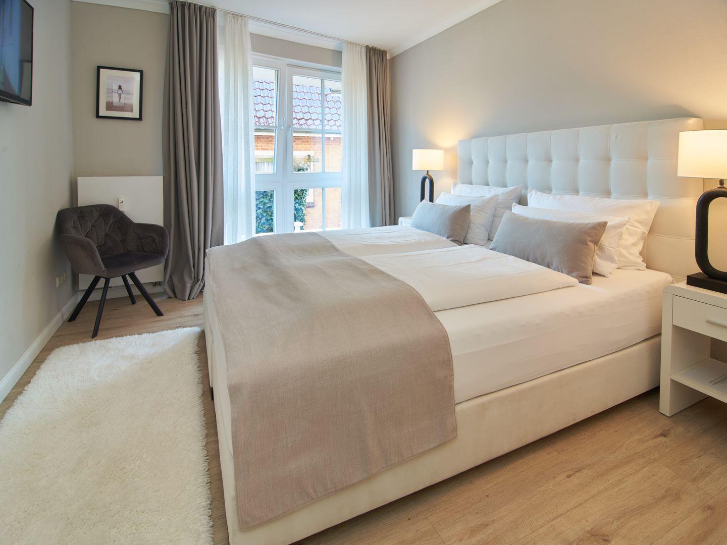 Das Wohnzimmer lädt mit einem gemütlichen Sofa und Sessel in hellen Farben zum Wohlfühlen ein. Smart-TV, WLAN und die kleine Musikanlage runden das technische Angebot ab. Die separate, neue Küche beinhaltet eine zeitgemäße Ausstattung und eine Essgruppe zum Schlemmen. Der großzügige Balkon ist vom Wohnzimmer und der Küche aus zugänglich und ebenfalls rückseitig gelegen. Hier können Sie warme Sommerabende entspannt ausklingen lassen. Das ruhige Hauptschlafzimmer beinhaltet ein großes Boxspringbett mit Überlänge, einen zweiten TV und ein Ambiente, das zum Träumen einlädt. Das zweite, kleine Schlafzimmer ist mit zwei separaten Einzelbetten (Boxspringbetten) und in hellen Tönen gestaltet. Das Bad mit Fenster wurde 2021 saniert und verfügt nun unter anderem über eine große Dusche und ein ansprechendes Design.