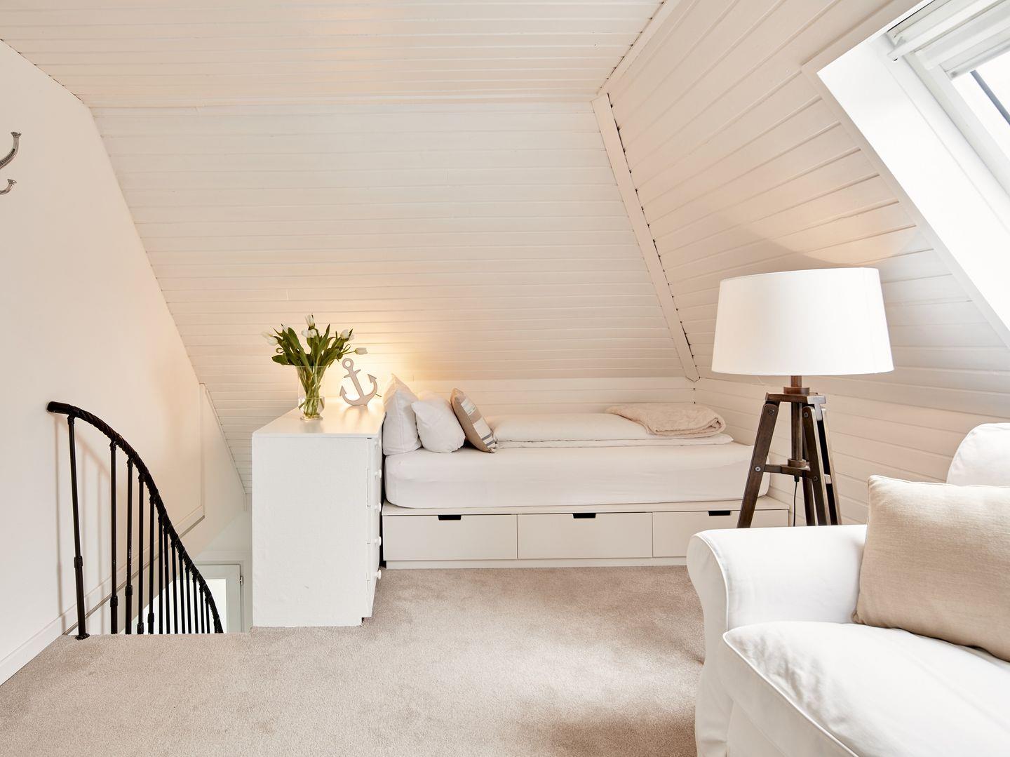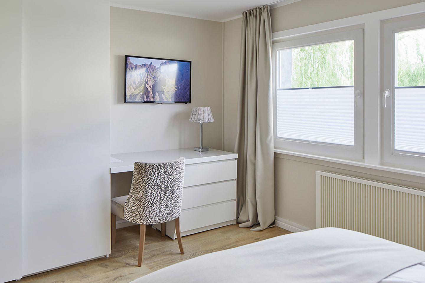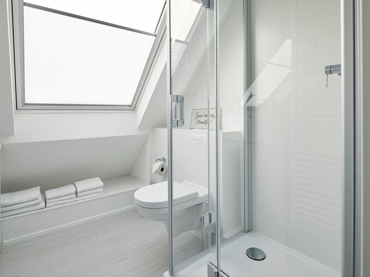 Das Schlafzimmer bietet ein komfortables Boxspringbett, TV und verdunkelbare Gardinen. Die moderne Küche mit Geschirrspüler und Waschmaschine ist stilvoll und praktisch eingerichtet. Ein kleines, komfortables Bad mit ebenerdiger Dusche und WC ergänzt diese Etage.