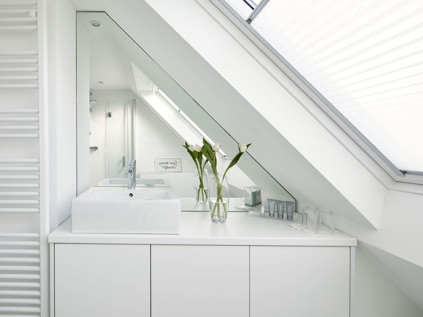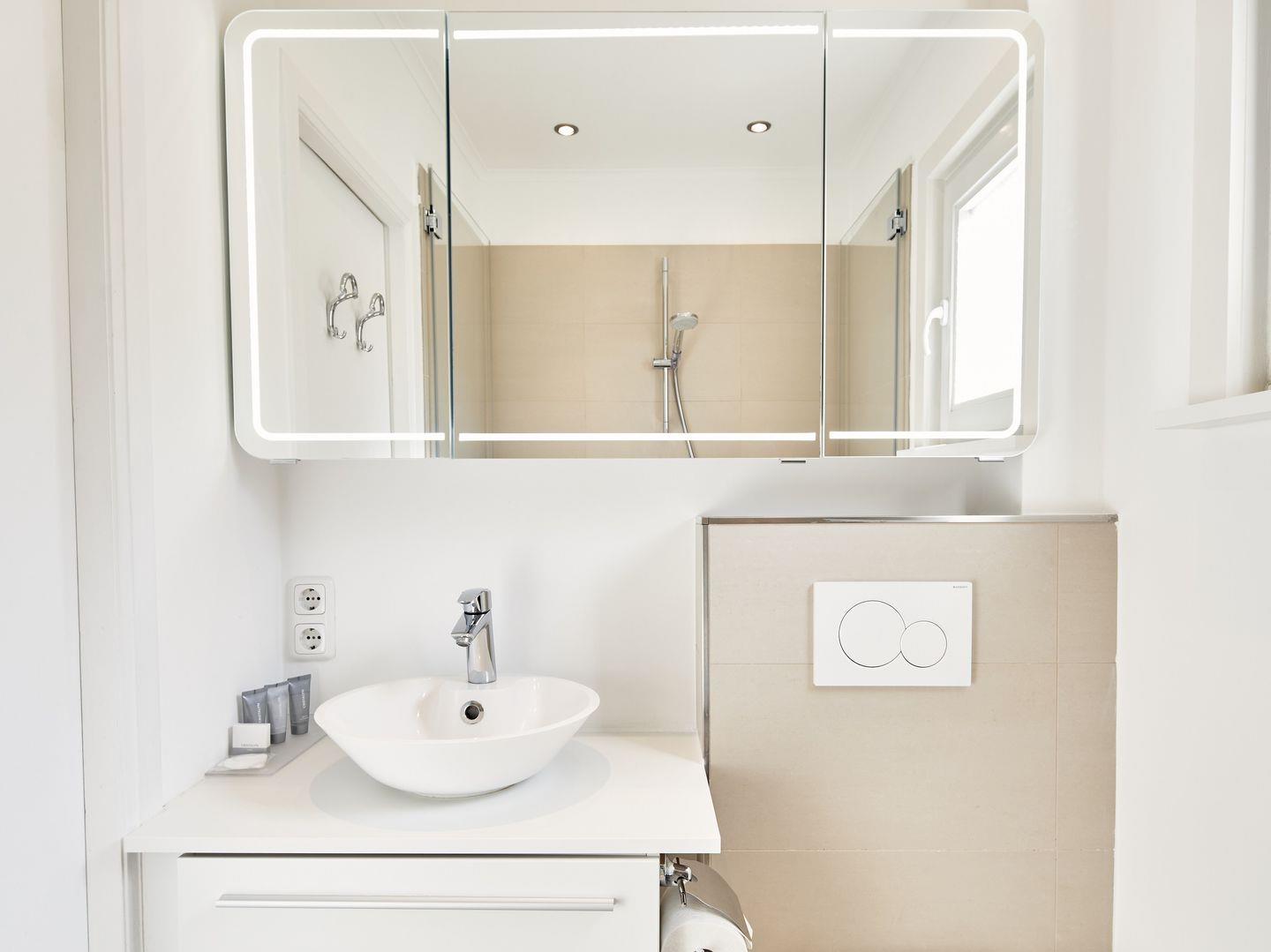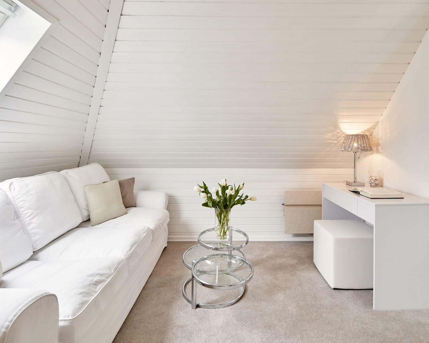 Das Schlafzimmer bietet ein komfortables Boxspringbett, TV und verdunkelbare Gardinen. Die moderne Küche mit Geschirrspüler und Waschmaschine ist stilvoll und praktisch eingerichtet. Ein kleines, komfortables Bad mit ebenerdiger Dusche und WC ergänzt diese Etage.
