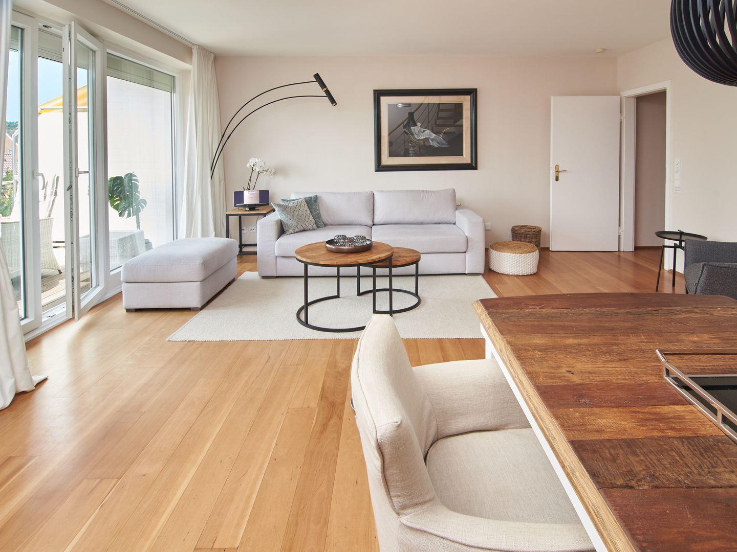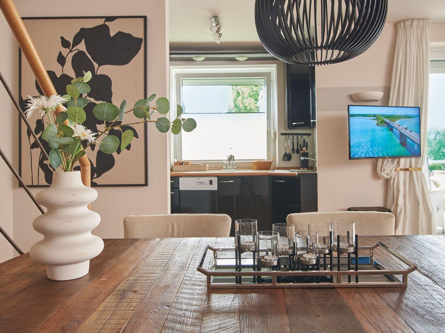 Das offen gehaltene Apartment verfügt über zwei Etagen, 75 m² und hochwertiges Parkett. Im unteren Bereich befindet sich zum einen der großzügige Wohnraum mit gemütlichem Sofa, Sessel und Flachbild-TV. Das Interieur ist in hellen Tönen und mit Liebe zum Detail gehalten.
