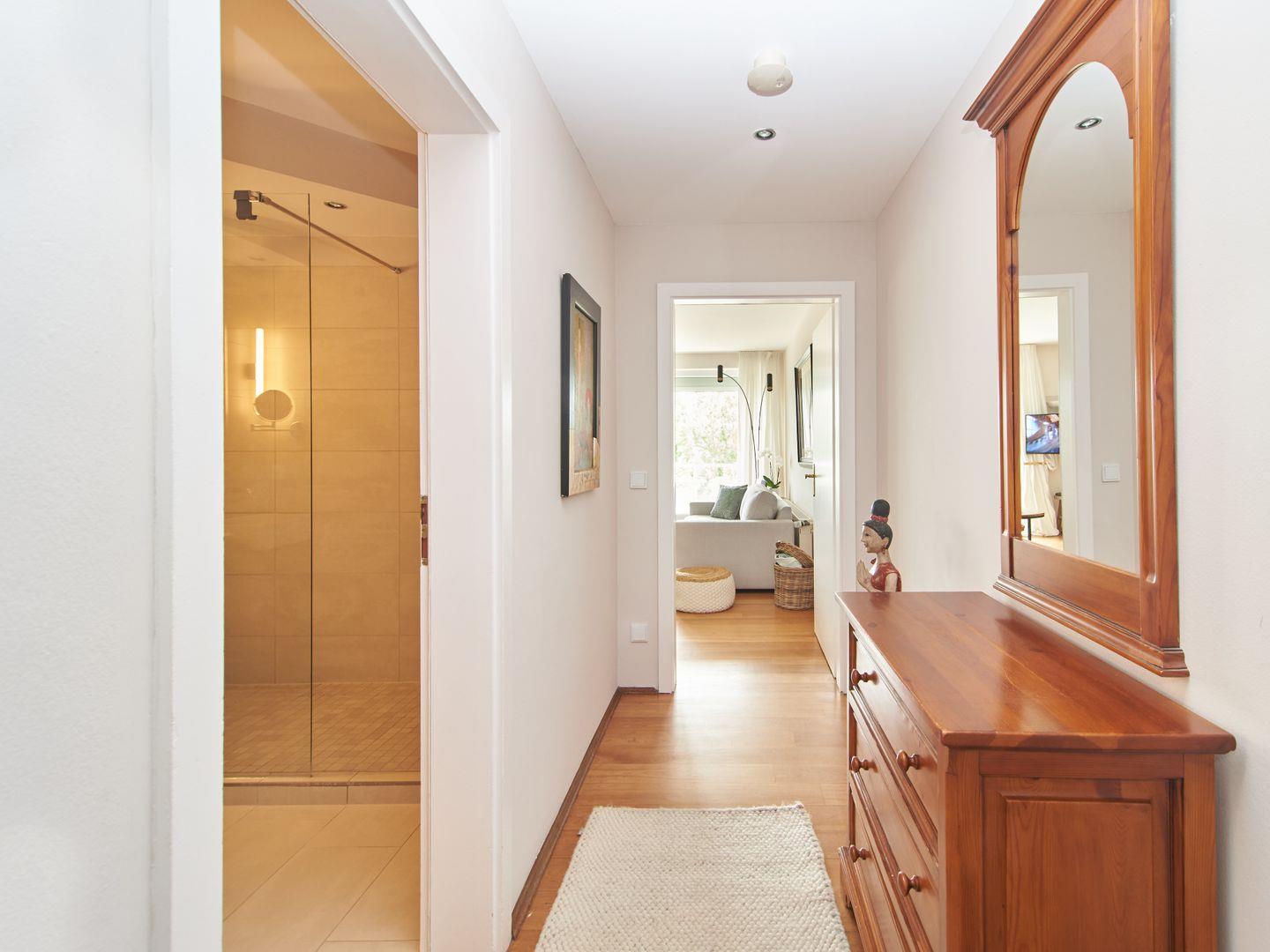 Der schöne Essbereich sowie die angrenzende Küchenzeile mit Geschirrspüler und moderner Ausstattung laden zum ausgiebigen Schlemmen und Kochen ein. Auf dem Balkon können Sie über den Tag verweilen und den Ausblick in den ruhigen Garten genießen. Das Bad wurde mit einer großen Dusche und zwei Waschtischen neu gestaltet und verfügt über ein schönes Ambiente.