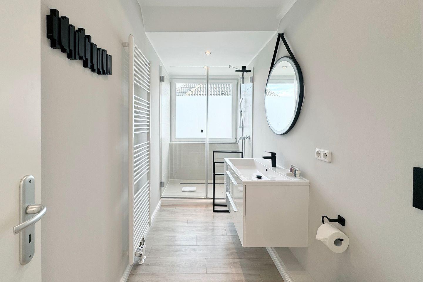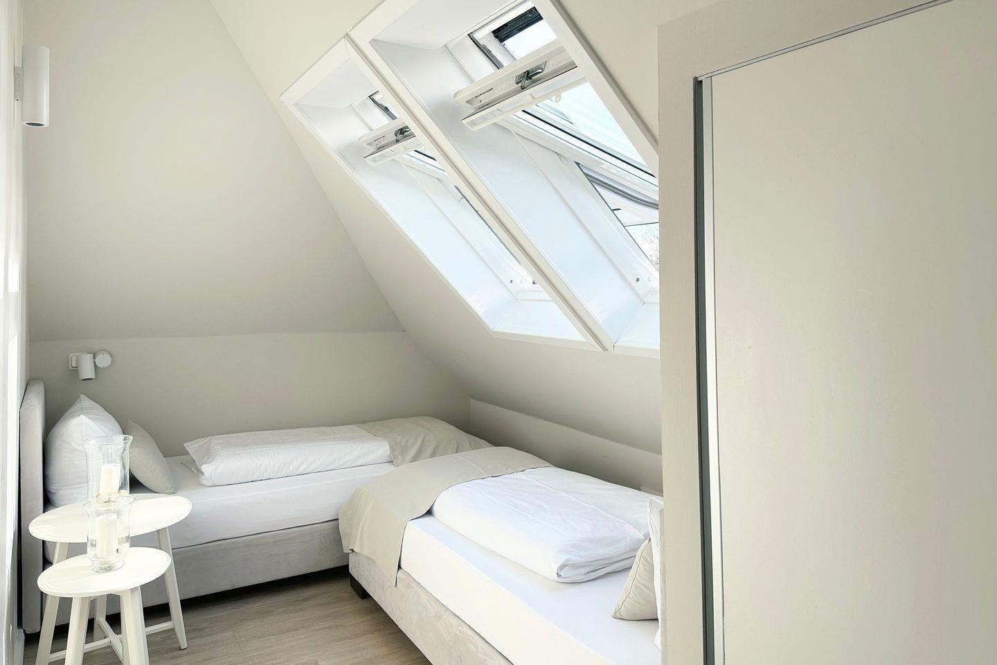 In dem größeren Schlafzimmer befindet sich ein großes Doppelbett und TV in einem schönen Ambiente. Das zweite, kleine Schlafzimmer beinhaltet zwei Einzelbetten und lädt zum Träumen ein. Daneben liegt das Bad mit Fenster und einer großzügigen Dusche im neuen Design.