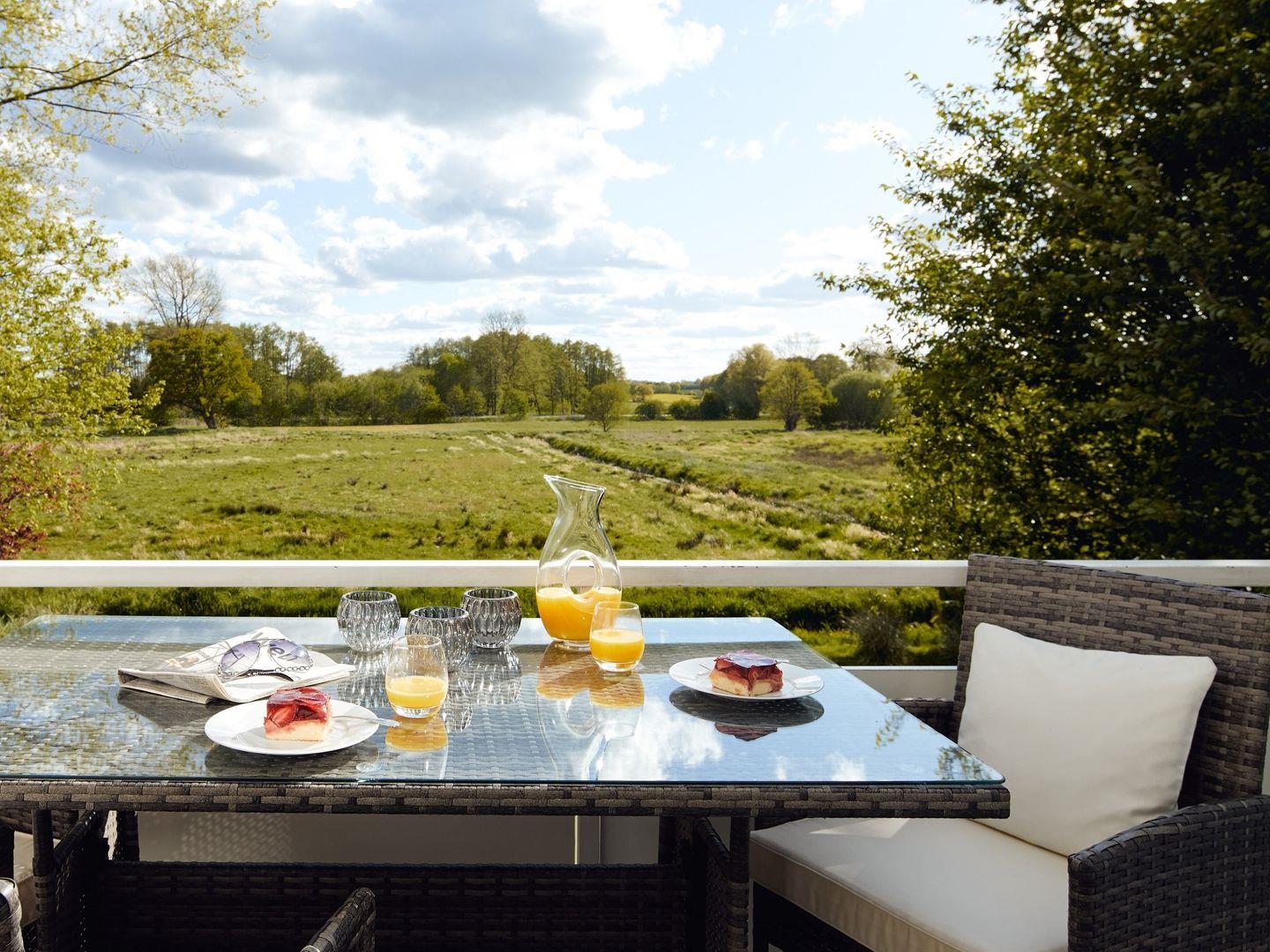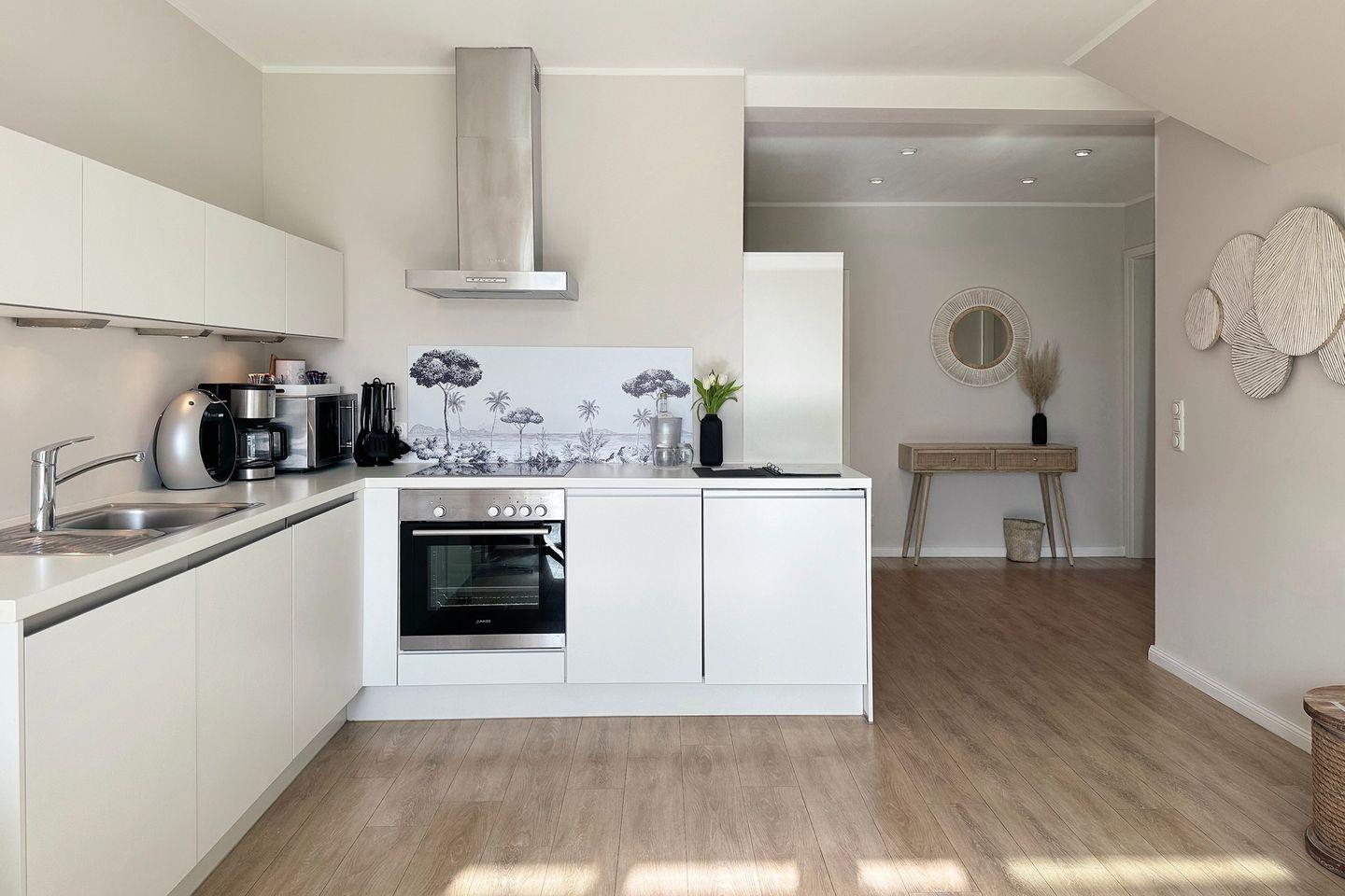 Das Apartment "Küstenlicht" mit zwei Schlafzimmern liegt in der ersten Etage des Hauses. Es bietet einen optimalen Rahmen für einen schönen Urlaub und wurde 2024 geschmackvoll erneuert. Das Wohnzimmer verfügt über eine Sitzecke mit einem großem Ecksofa und gemütlichen Essbereich. Die offene Küche beinhaltet eine moderne Ausstattung. Auch der Flachbild-TV mit neuester Smarttechnik sowie das WLAN erfüllt zeitgemäße Ansprüche. Der angrenzende Balkon ermöglicht eine erholsame Zeit mit einem wunderbaren Blick auf die Felder.