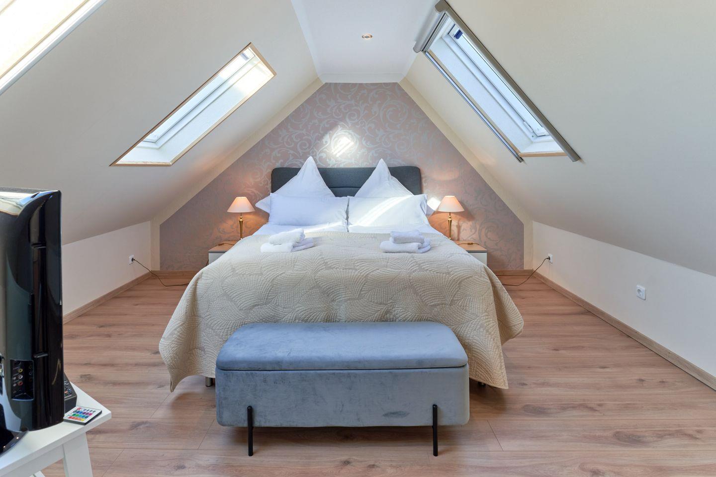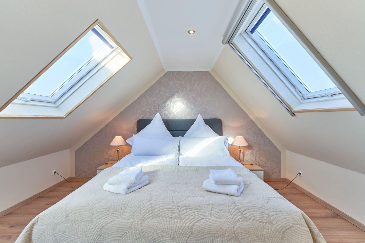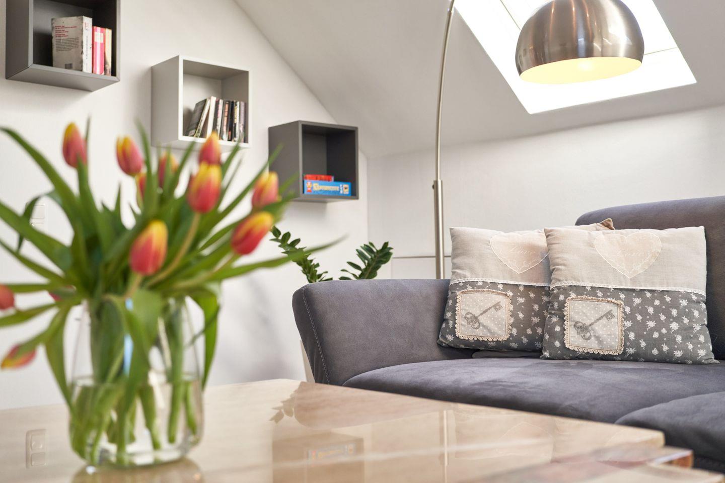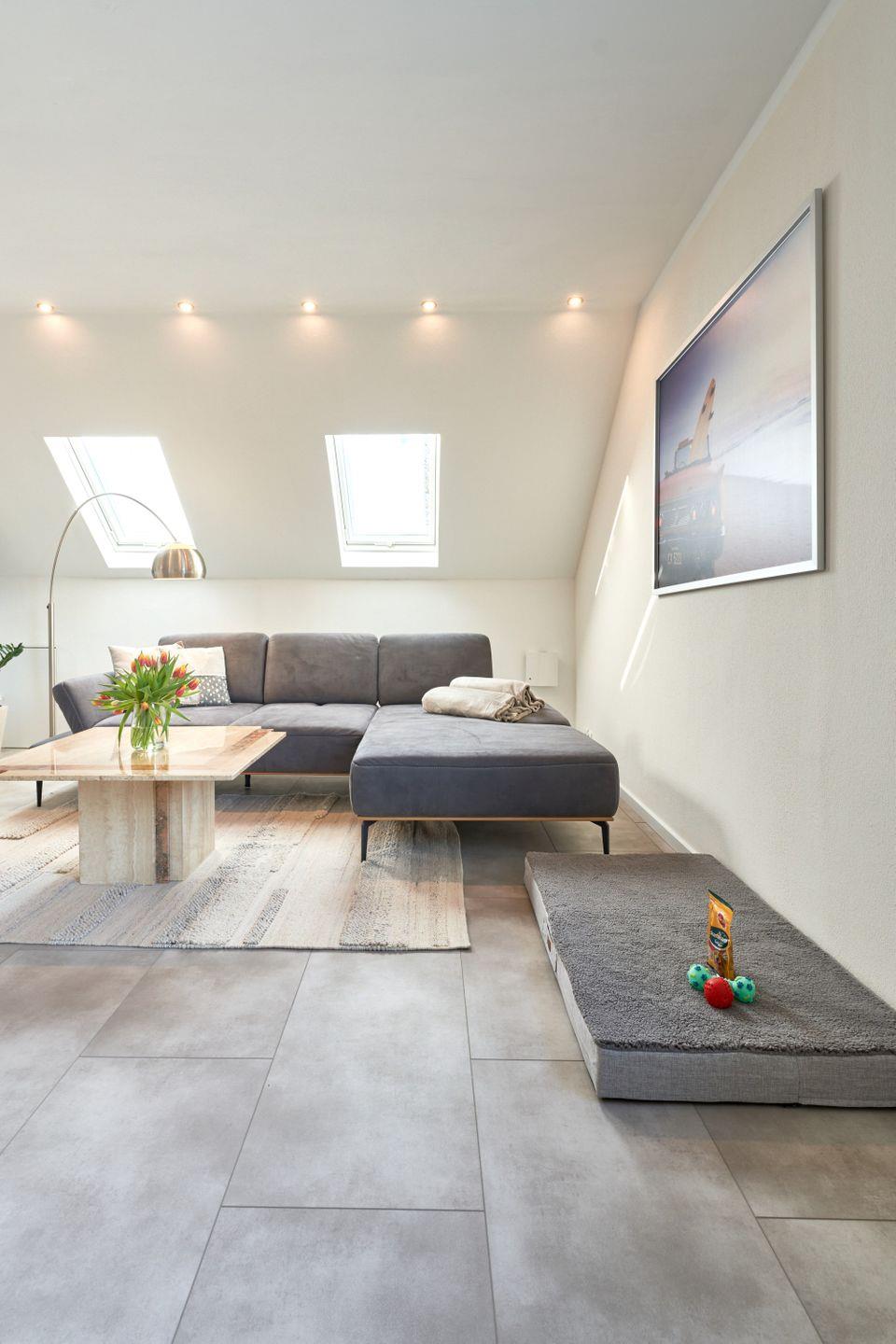 Die Wohnung erstreckt sich über 95 qm und 2 Ebenen, Luxus Küche, offener Wohn-Essbereich, ein modernes Badezimmer mit großer Dusche und Badewanne verwöhnen den Gast, ebenso wie das Schlafzimmer im Dachgeschoß.