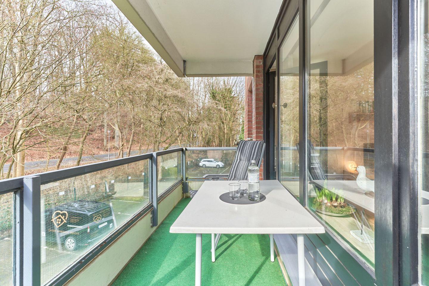 Das moderne Bad verfügt über eine Badewanne mit integrierter Dusche. Der möblierte Balkon mit Blick ins Grüne rundet das Wohlfühlambiente ab.