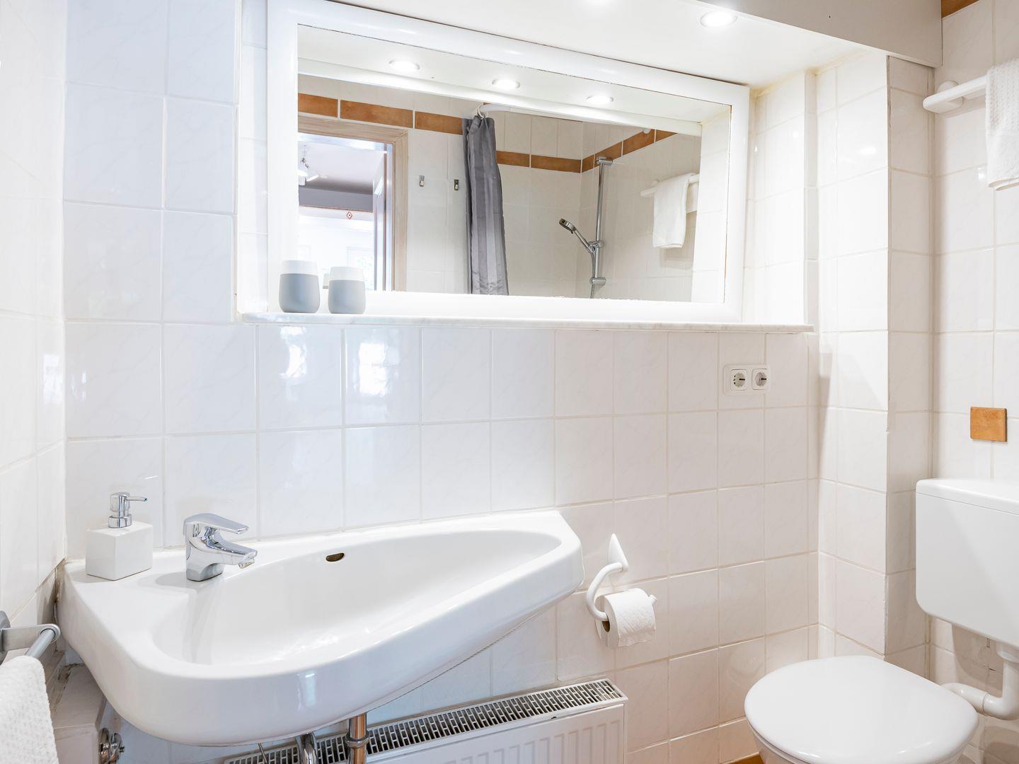 Das geschmackvoll möblierte Schlafzimmer bietet ein hochwertiges Doppelbett (2x 90x200 cm) und einen geräumigen Kleiderschrank. Bei Bedarf ist hier auch Platz für ein Kinderreisebett. Das angrenzende Badezimmer ist hell gefliest und verfügt über eine erfrischende Dusche, ein WC, einen Fön sowie ein Waschbecken mit einem beleuchteten Spiegel.