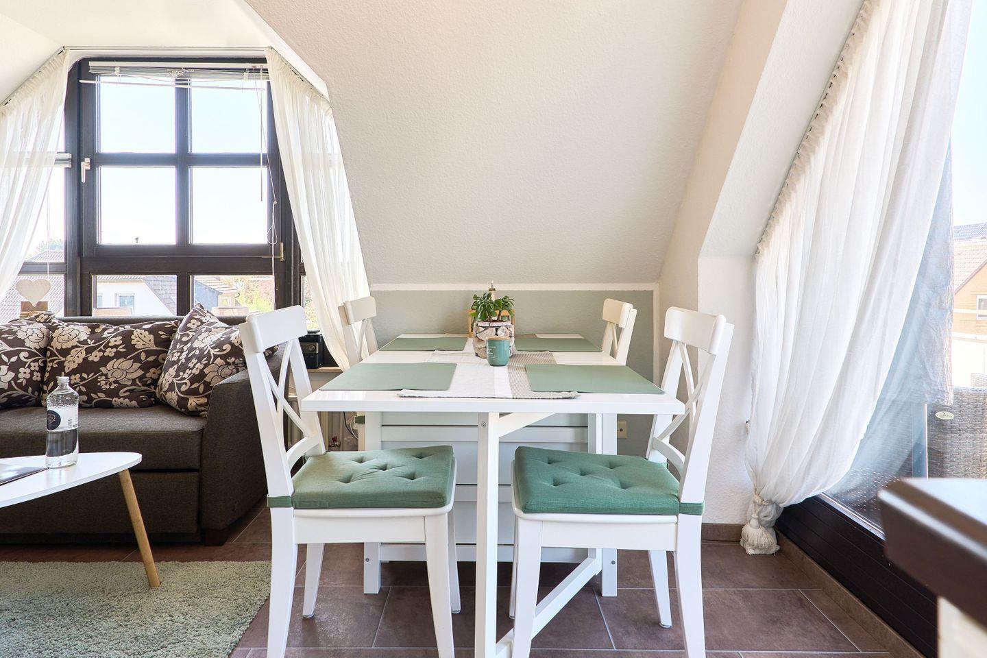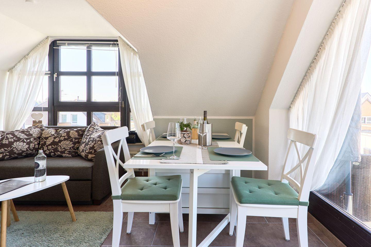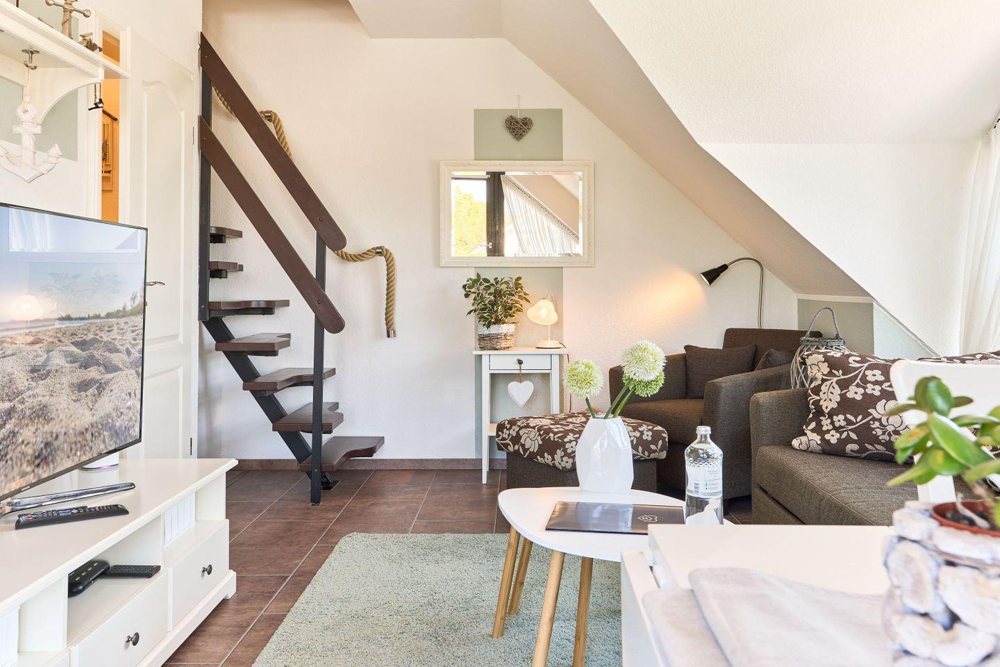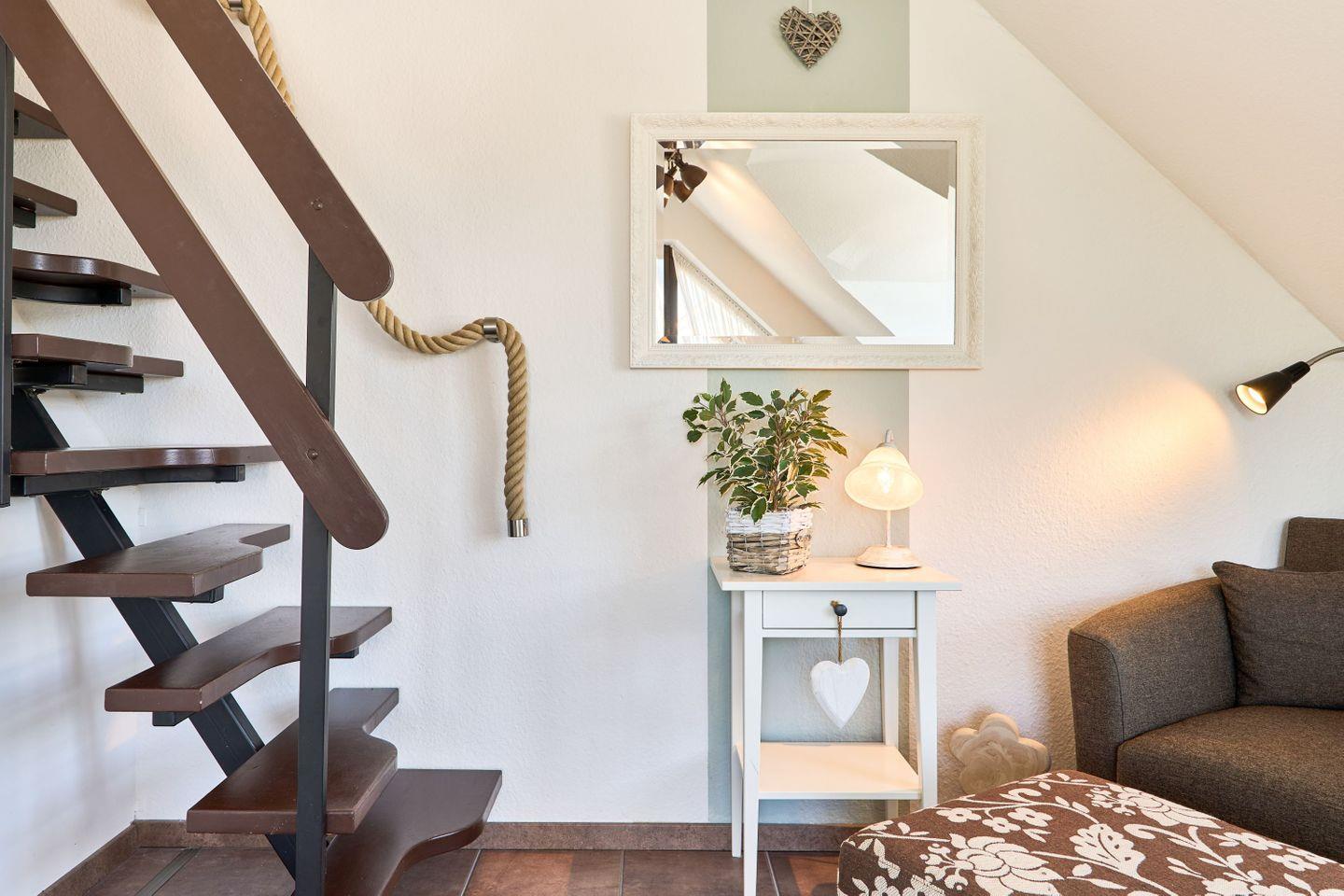 Die Wohnung erstreckt sich über 45qm und 2 Ebenen, ,offener Wohn-Essbereich, ein modernes Badezimmer mit Dusche und ein Sonnenbalkon verwöhnen den Gast, ebenso wie das Schlafzimmer im Dachgeschoß.