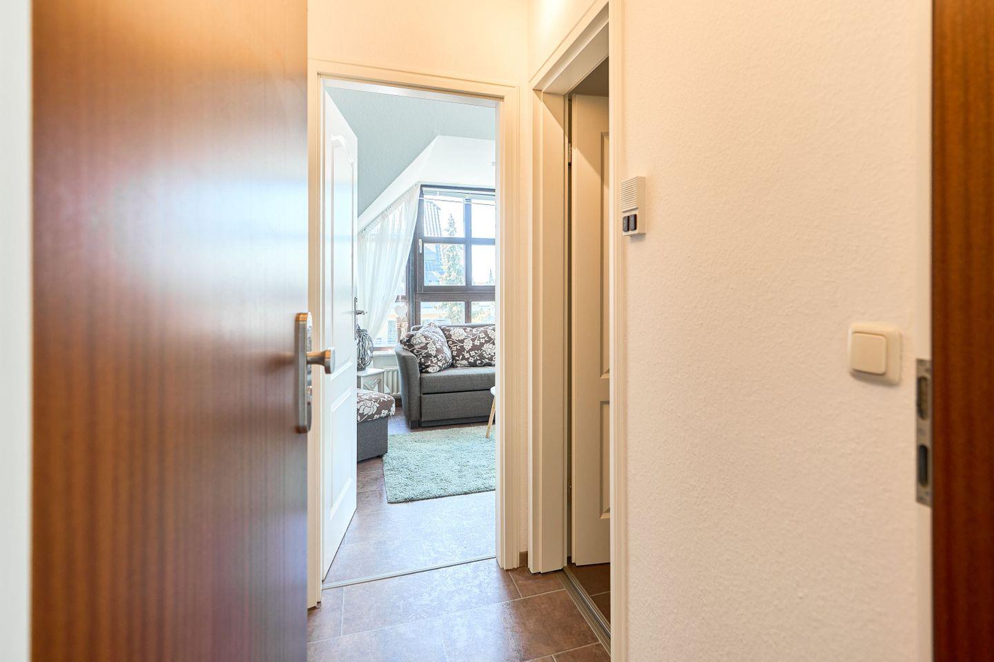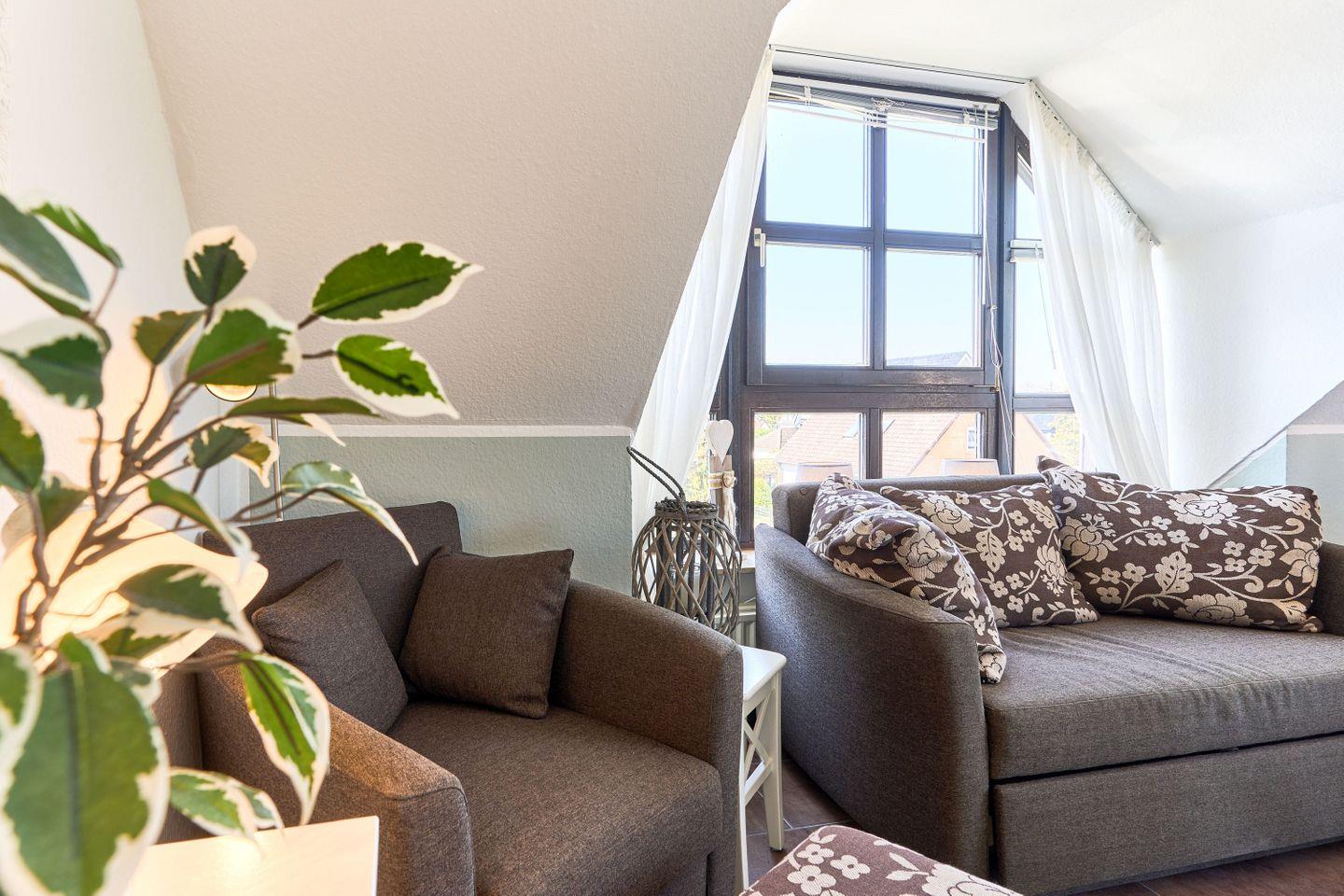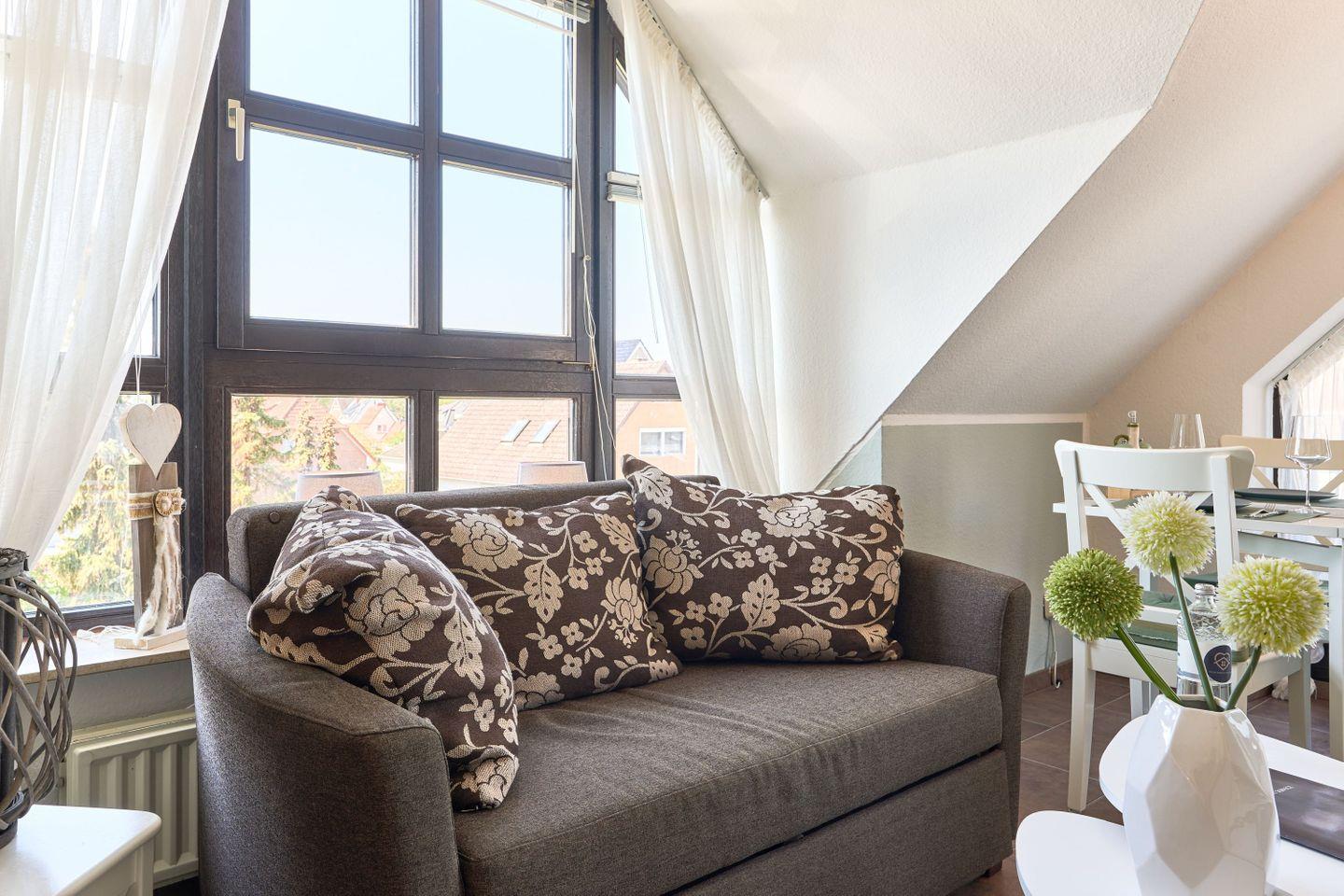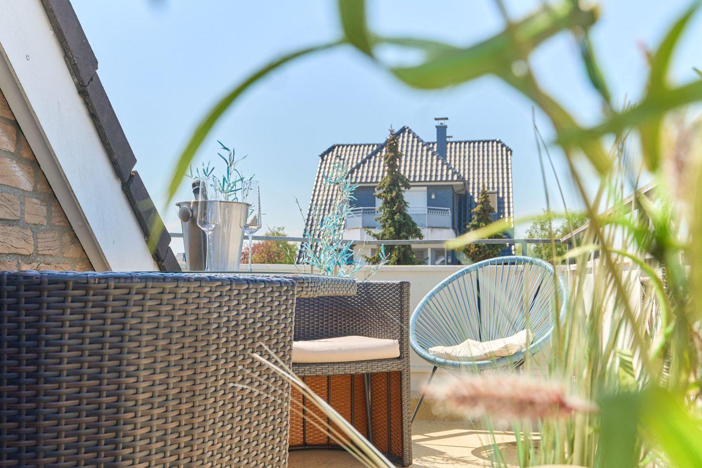 Die Wohnung erstreckt sich über 45qm und 2 Ebenen, ,offener Wohn-Essbereich, ein modernes Badezimmer mit Dusche und ein Sonnenbalkon verwöhnen den Gast, ebenso wie das Schlafzimmer im Dachgeschoß.