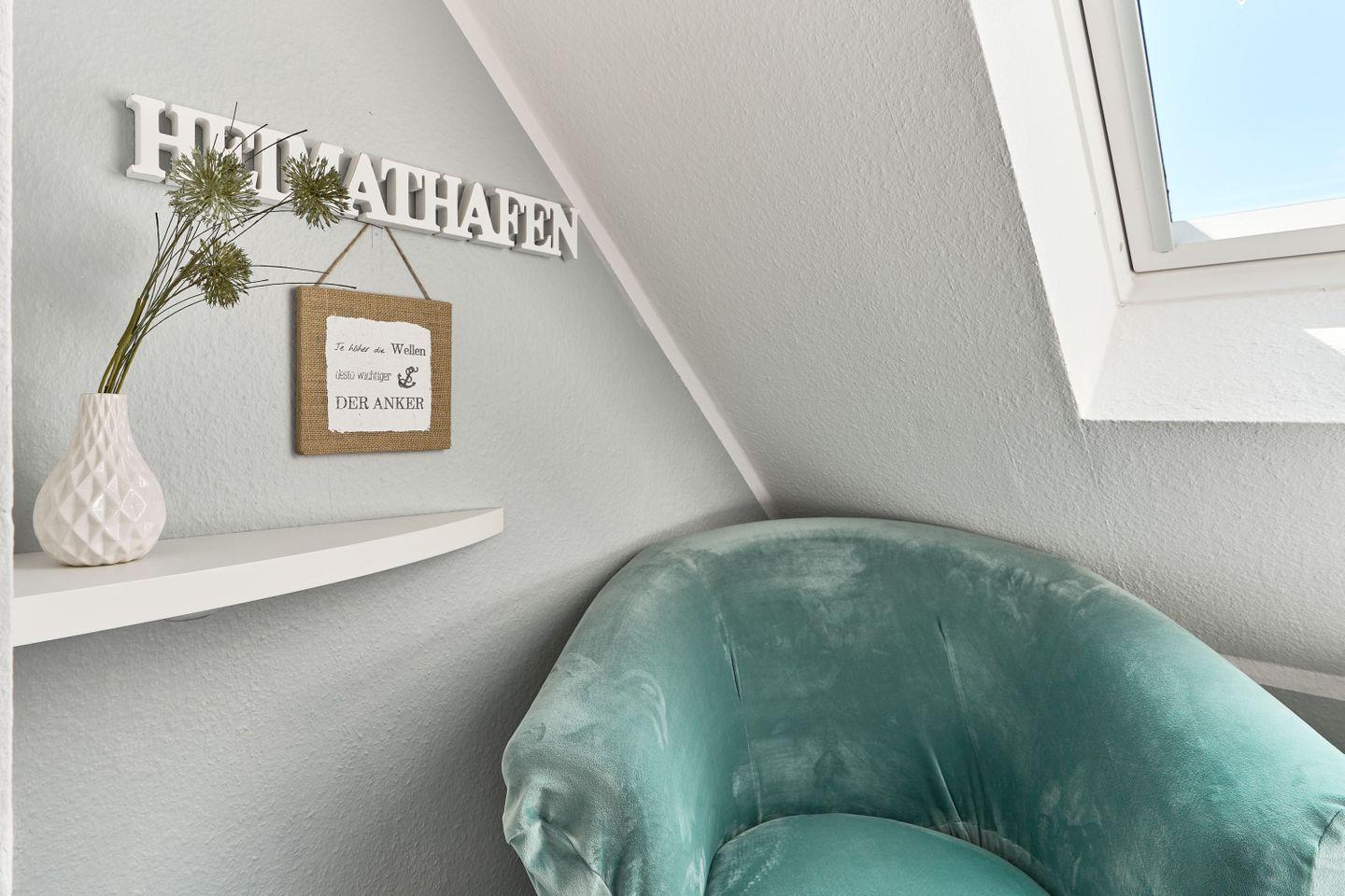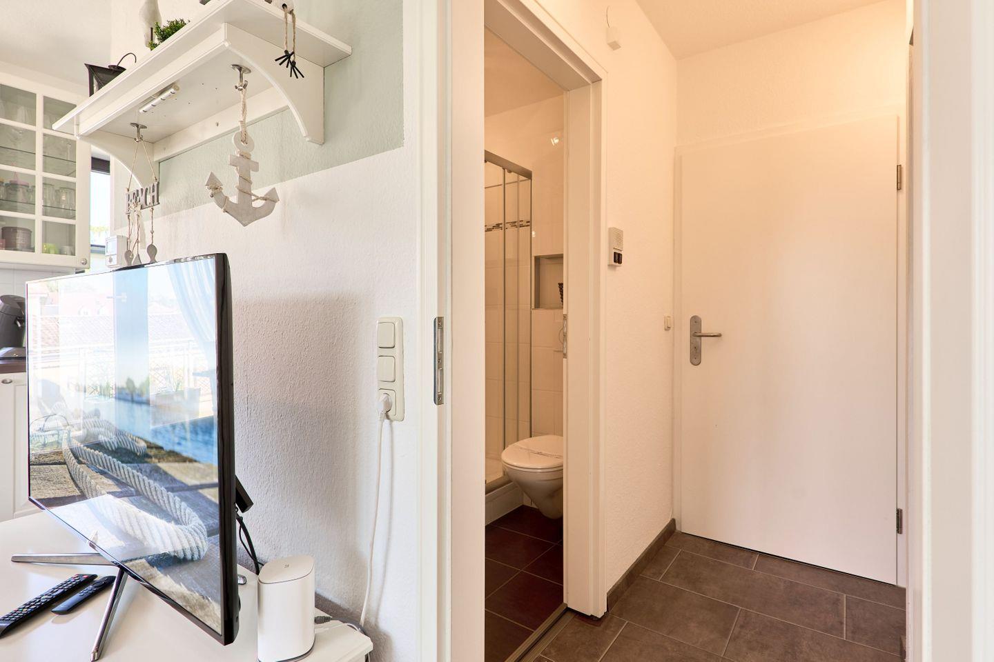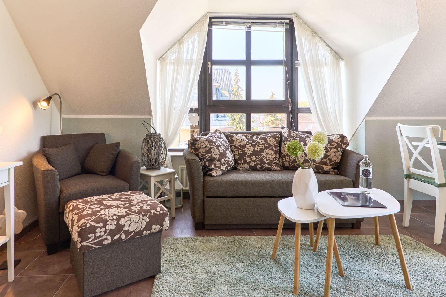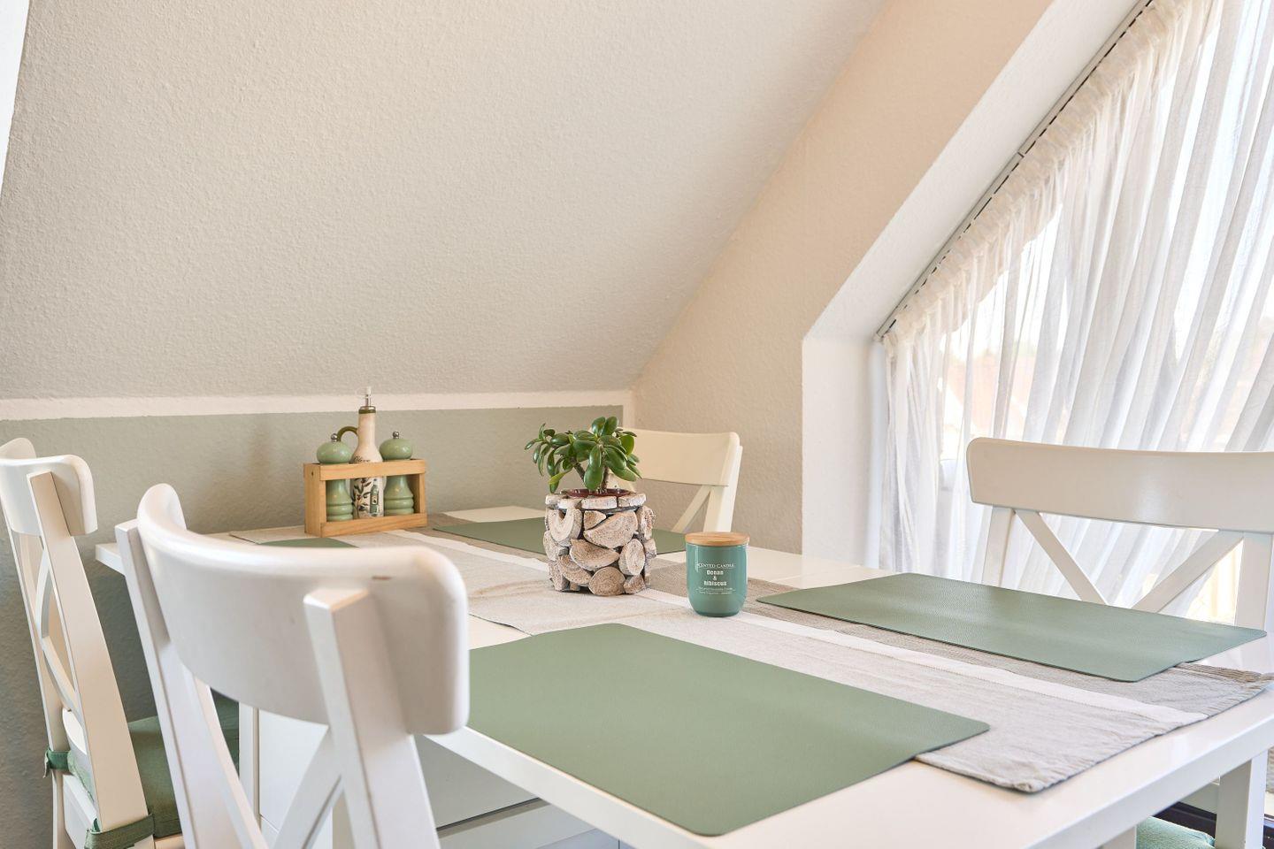 Die Wohnung erstreckt sich über 45qm und 2 Ebenen, ,offener Wohn-Essbereich, ein modernes Badezimmer mit Dusche und ein Sonnenbalkon verwöhnen den Gast, ebenso wie das Schlafzimmer im Dachgeschoß.