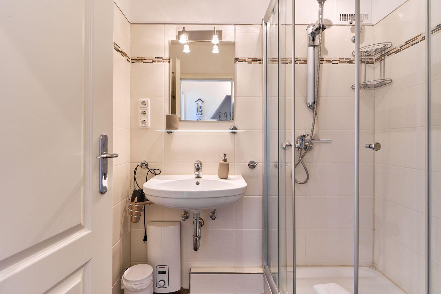 Das Badezimmer ist mit einer Dusche, einem Handtuchwärmer, Schminkspiegel und Föhn ausgestattet.