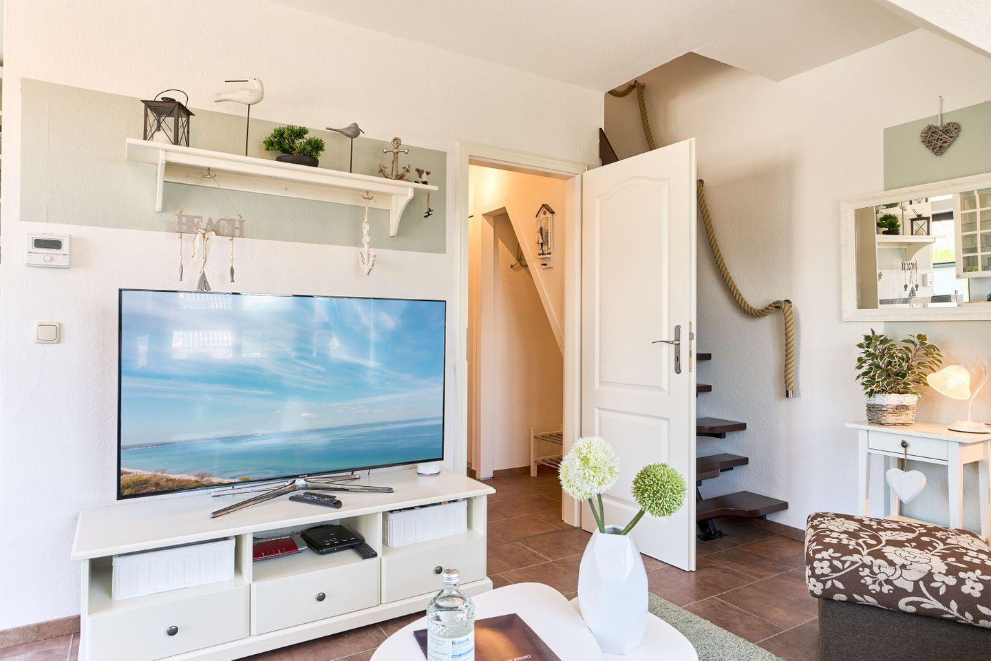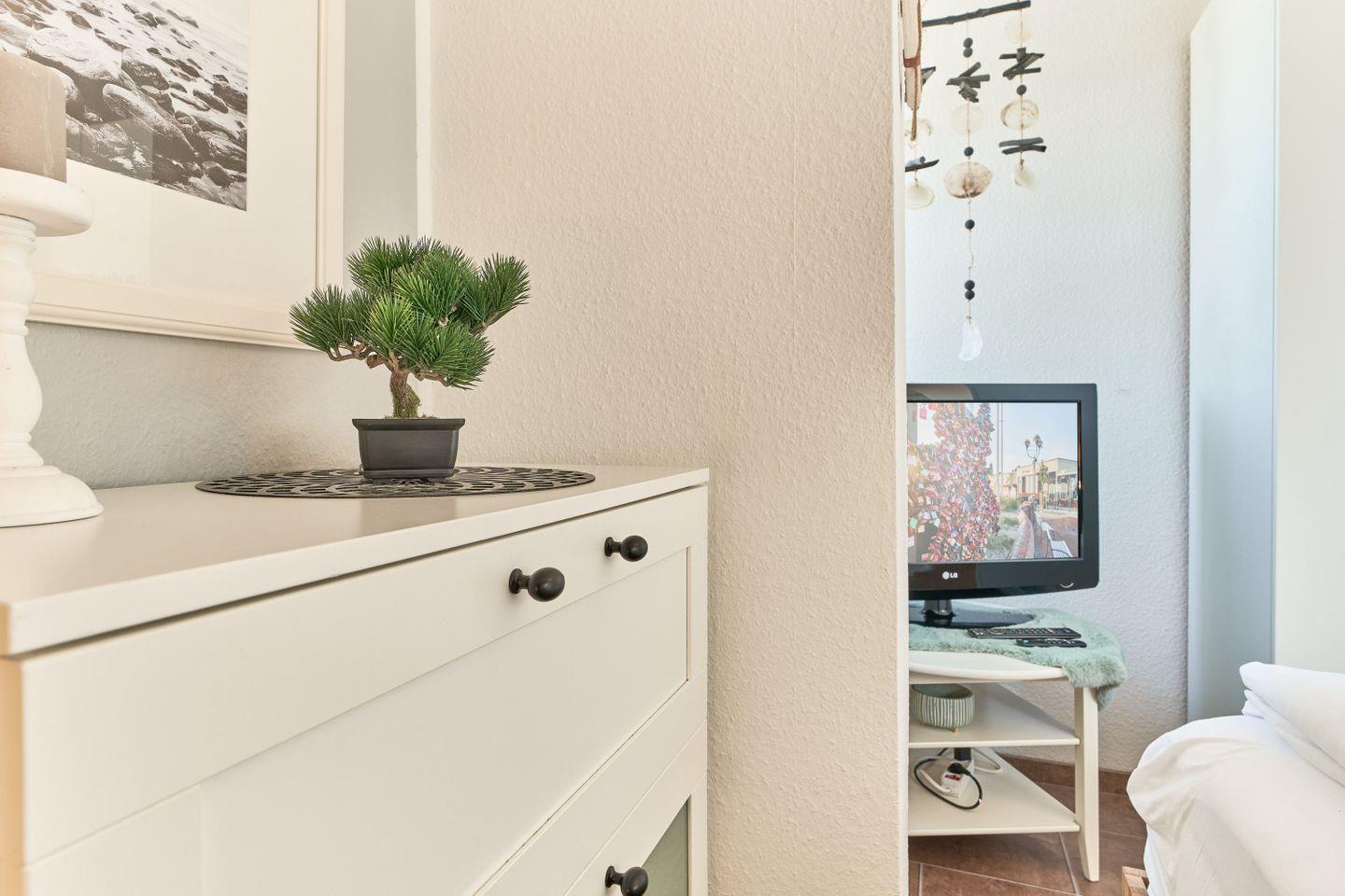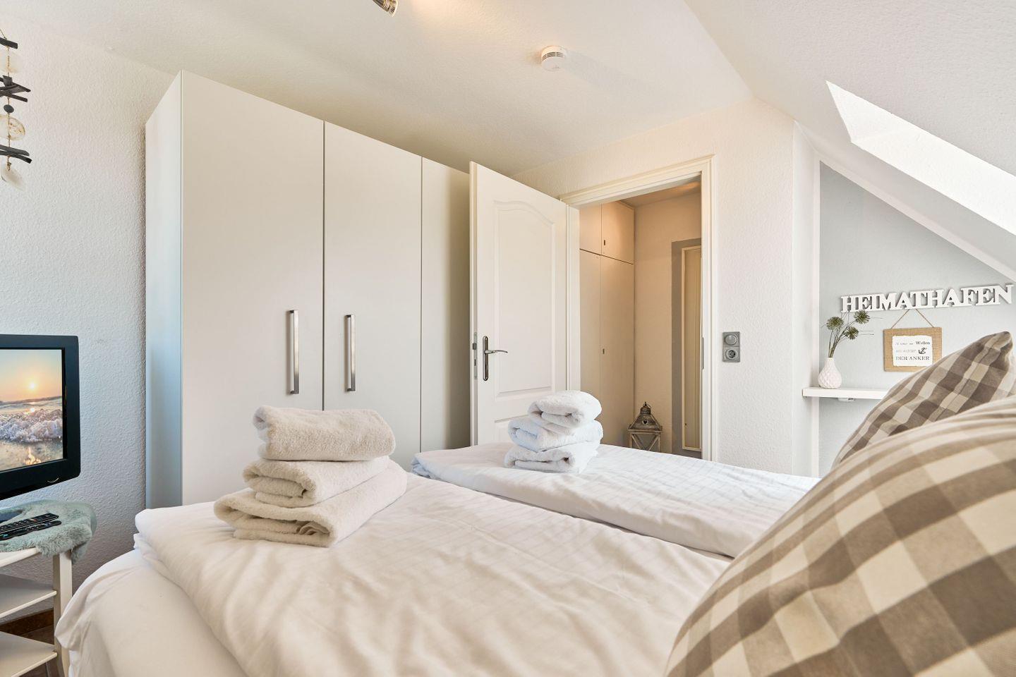 Um Ihnen einen erholsamen Schlaf zu garantieren, lässt sich der Schlafraum im Obergeschoß der Ferienwohnung verdunkeln. Ein weiterer Flatscreen-TV steht im Schlafzimmer unseren Gästen zur Verfügung. Stauraum für die Urlaubsbekleidung stehen im Schlafzimmer im OG in einem Kleiderschrank und im Eingangsflur in einem kleinen Wandschrank zur Verfügung.