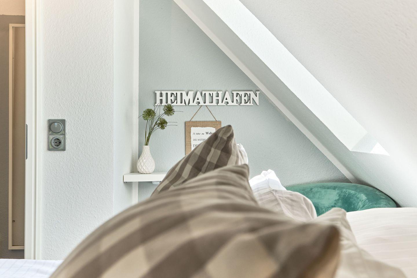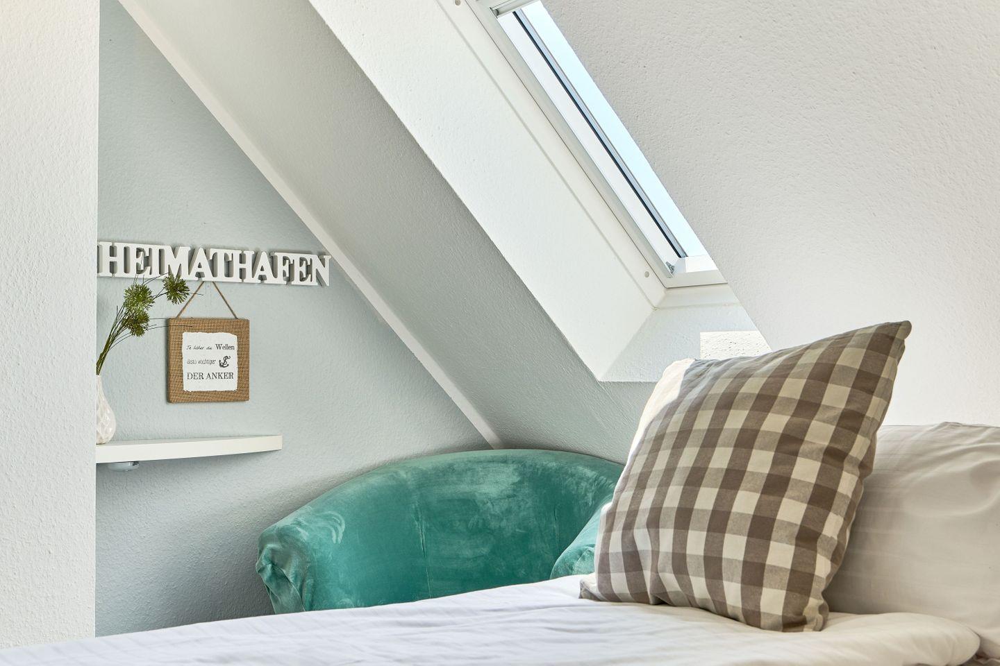 Das Schlafzimmer dieser Ferienwohnung Timmendorfer Strand ist mit einem komfortabelen Doppelbett (160 x 200 cm) ausgestattet und befindet sich im Obergeschoß und ist über eine sog. Raumspartreppe zu erreichen.