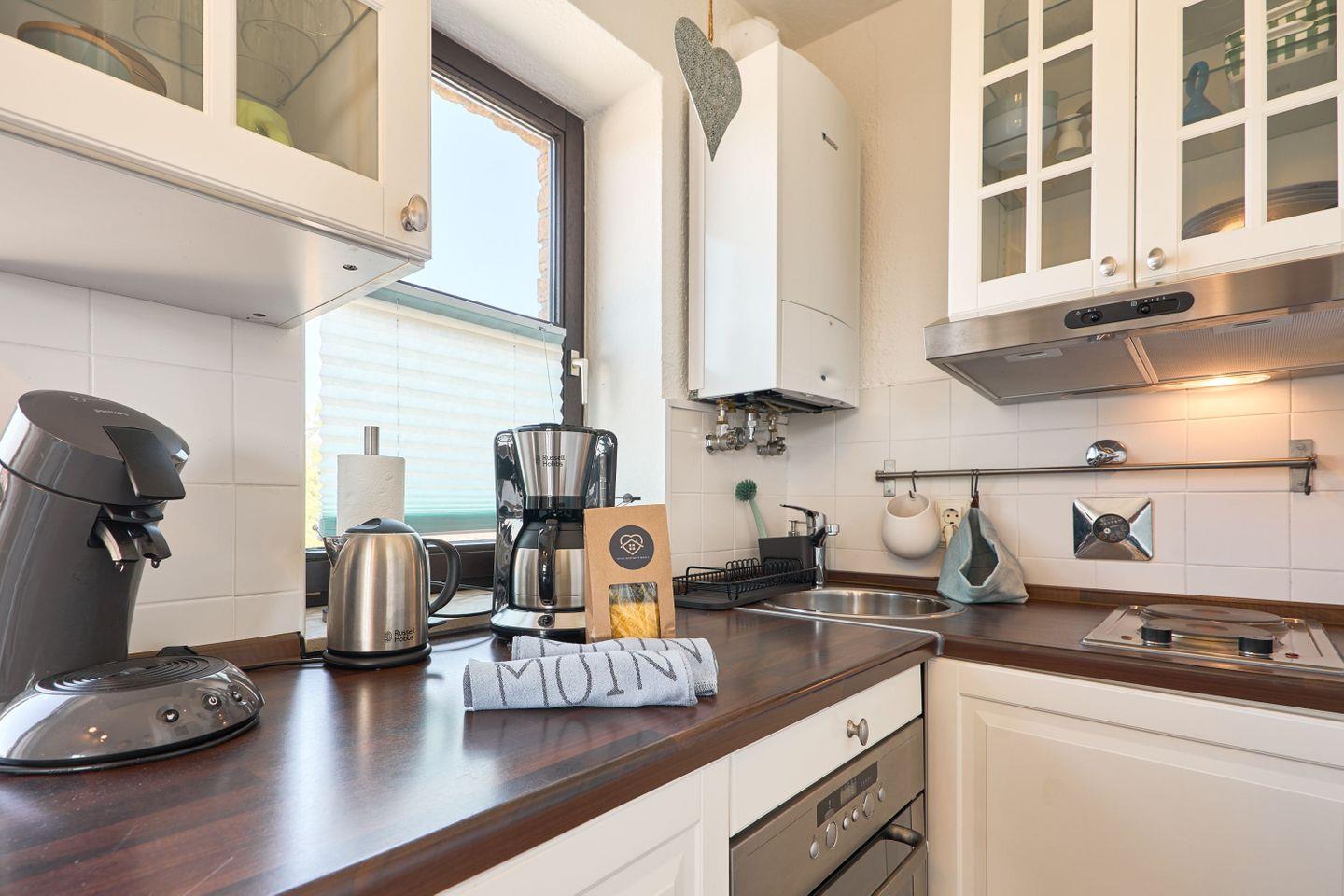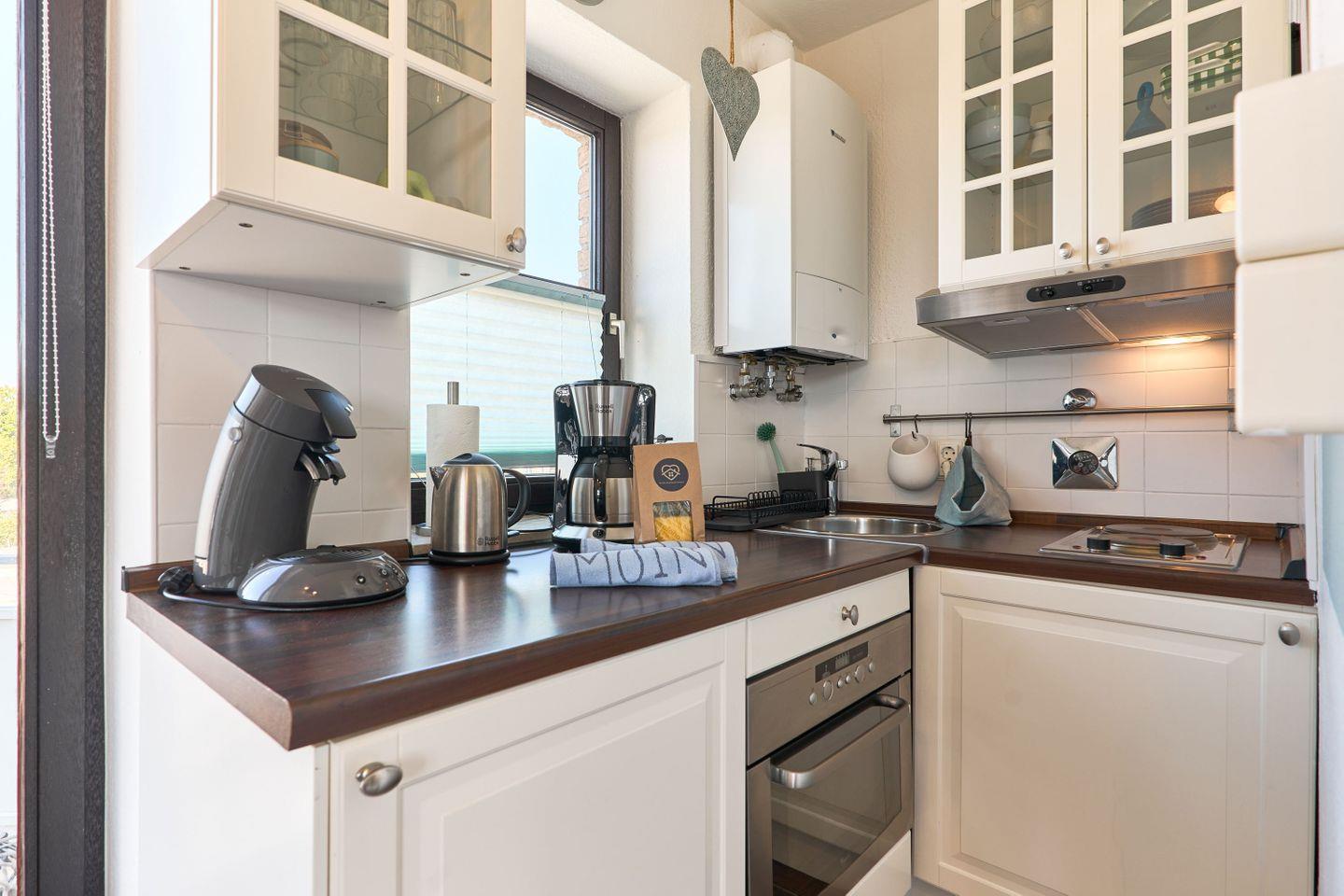 Die komplett ausgestattete Küchenzeile mit Kühlschrank, Herd, Backofen,Kaffeemaschine, Toaster und Senseomaschine sowie ausreichend Geschirr ist in den Wohnraum integriert und sorgt dafür, dass auch das Leibliche Wohl nicht zu kurz kommt.