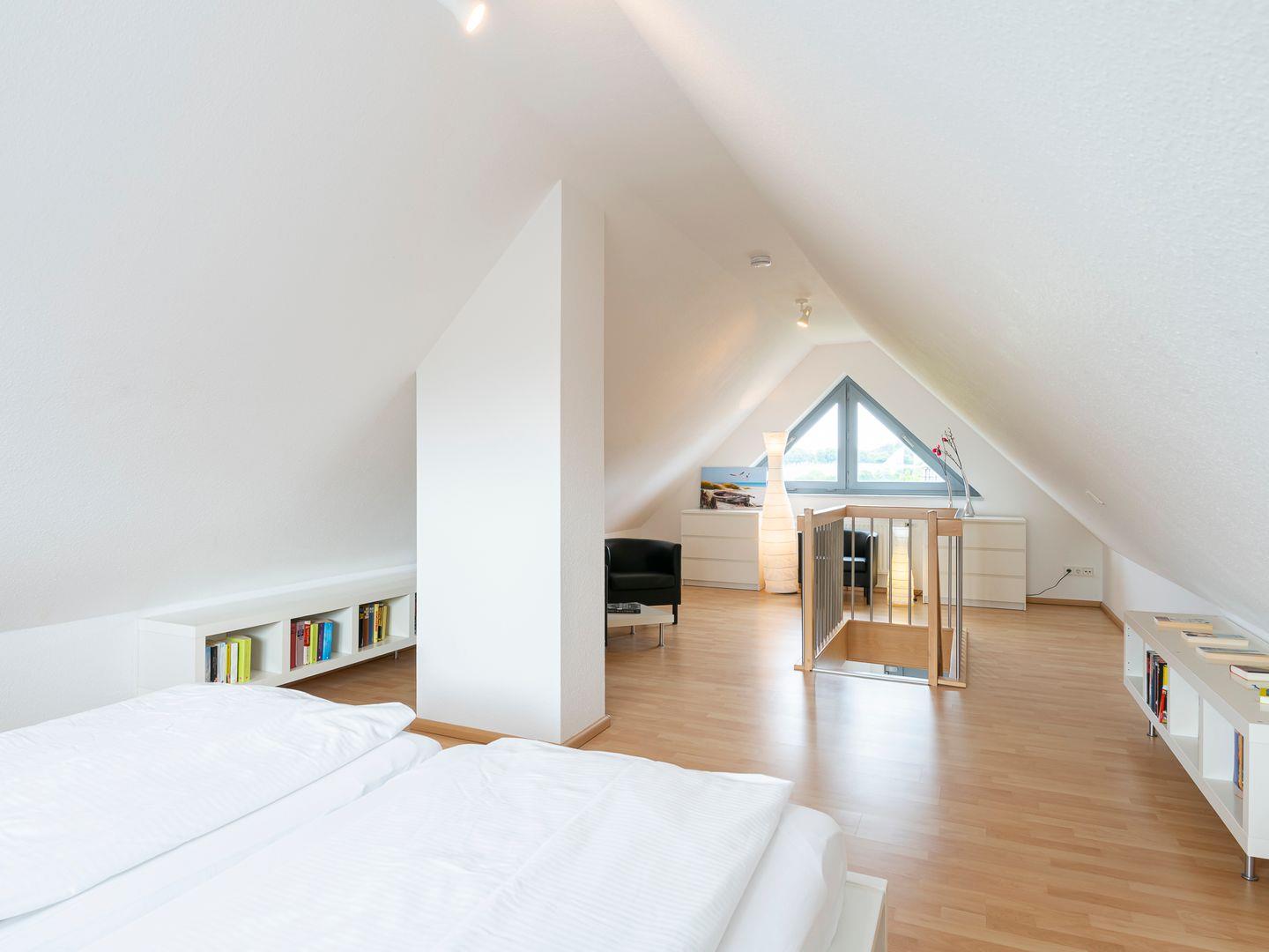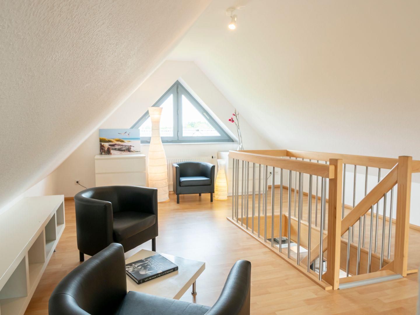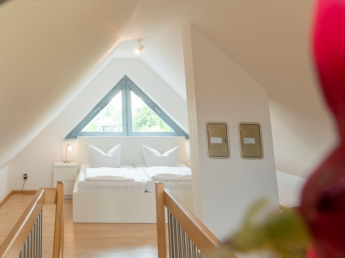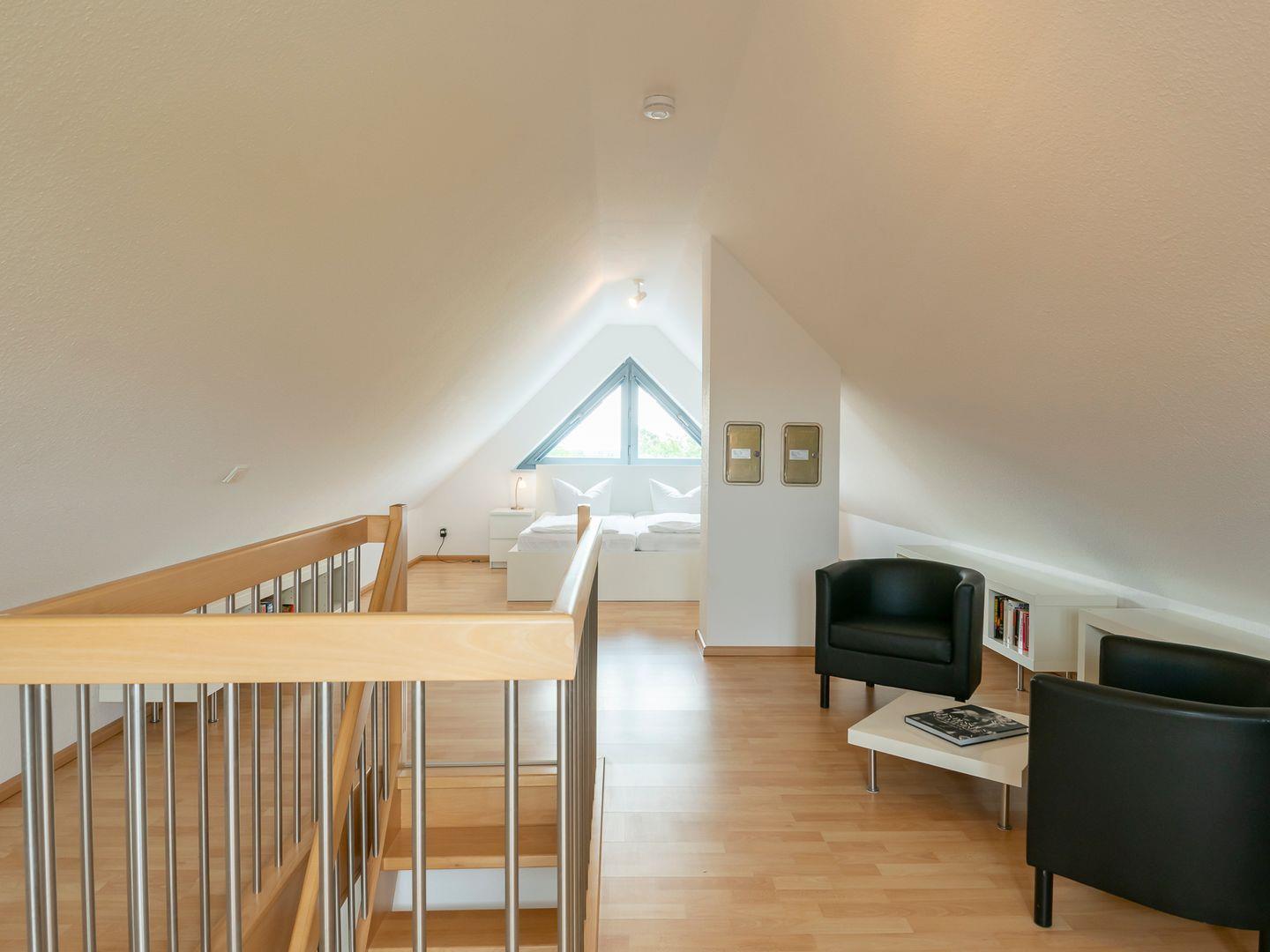 Die Maisonette-Ferienwohnung erstreckt sich über zwei Etagen (1. und 2. Obergeschoss) und bietet mit einer großzügigen Wohnfläche von etwa 52 m² ausreichend Platz und Komfort für zwei Personen. Der offene Wohn- und Essbereich ist liebevoll gestaltet und verfügt über ein gemütliches Ecksofa, eine moderne integrierte Küche und einen Essplatz für bis zu vier Personen. Im oberen Geschoss erwartet Sie ein separater Schlafbereich in der offenen Galerie mit einem komfortablen Doppelbett (2 x 90x200 cm). Das stilvoll gestaltete Badezimmer mit Dusche lädt zum Entspannen ein und ist mit einem praktischen Fön sowie einem beheizbaren Handtuchhalter ausgestattet.