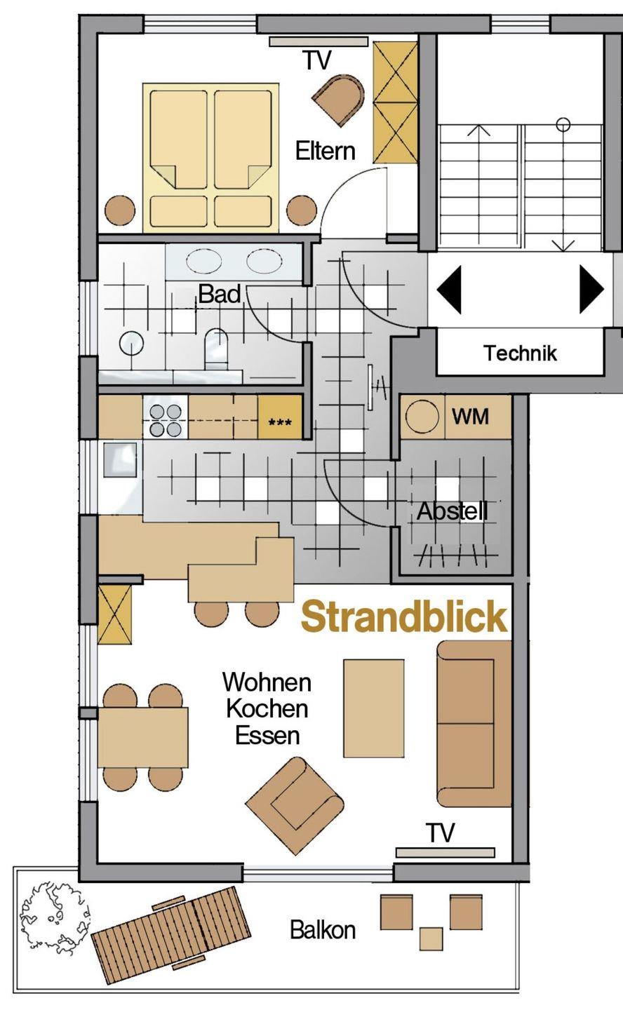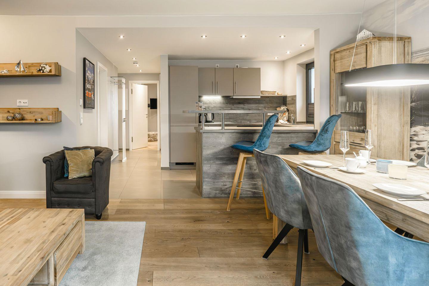 Die Ferienwohnungen Strandblick und Strandkorb befinden sich im 1. Obergeschoss. Sie sind jeweils 60 qm groß, für bis zu vier Personen ausgestattet und zeichnen sich durch ihre helle Gestaltung, den hochwertigen Echtholz-Parkettboden und ihre anspruchsvolle und detailverliebte Einrichtung aus. Mittelpunkt jeder Wohnungen ist der offene Wohnbereich, der Küche, Wohn- und Essbereich miteinander verbindet.