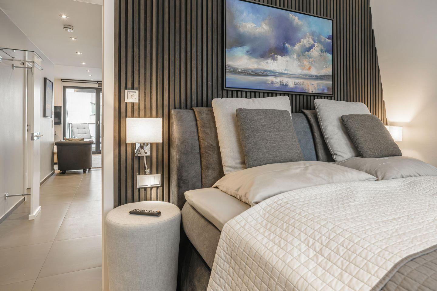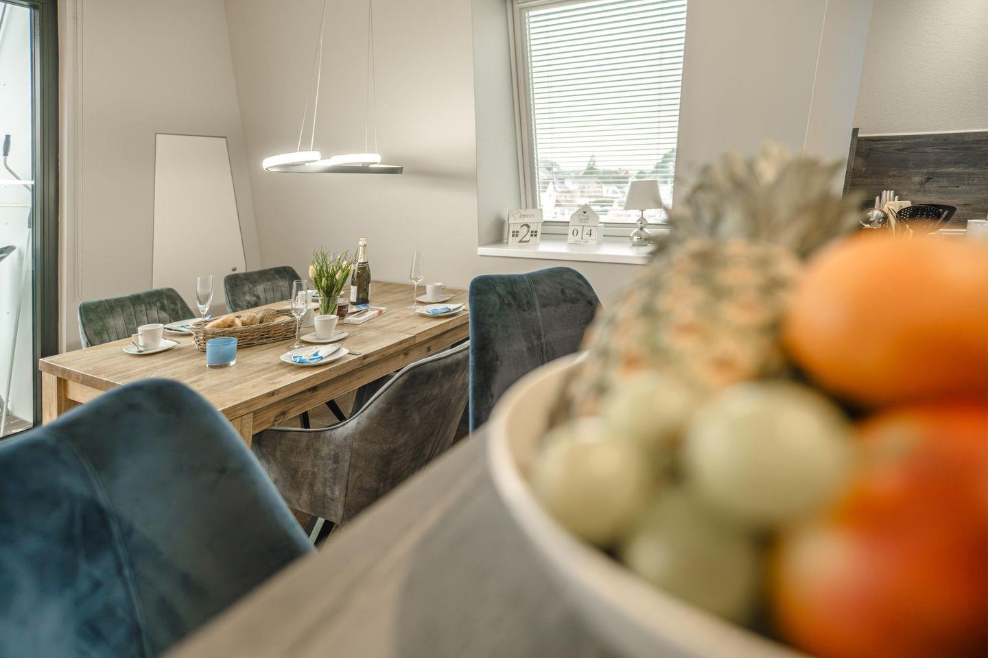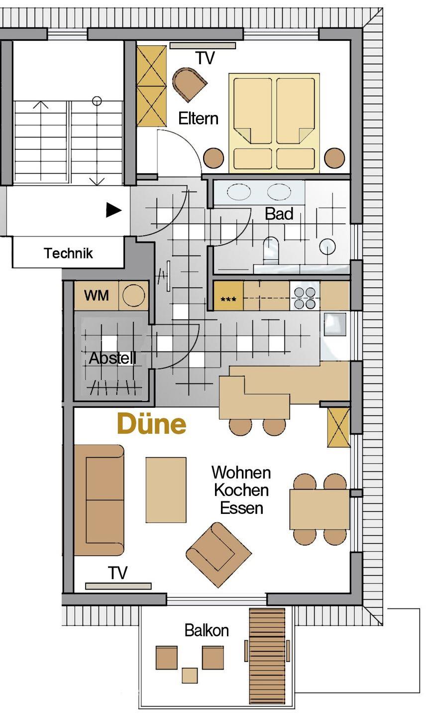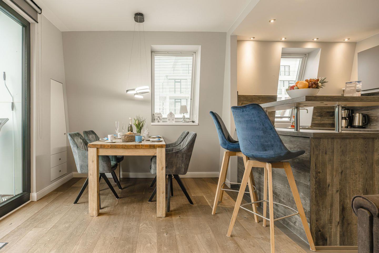 Die Ferienwohnungen Düne und Leuchtturm befinden sich im 2. Obergeschoss und entsprechen vom Schnitt, der Gestaltung und Ausstattung den Ferienwohnungen Strandblick und Strandkorb. Auch sie sind für bis zu vier Personen konzipiert, mit großen Fenstern und Echtholz-Parkettboden ausgestattet.