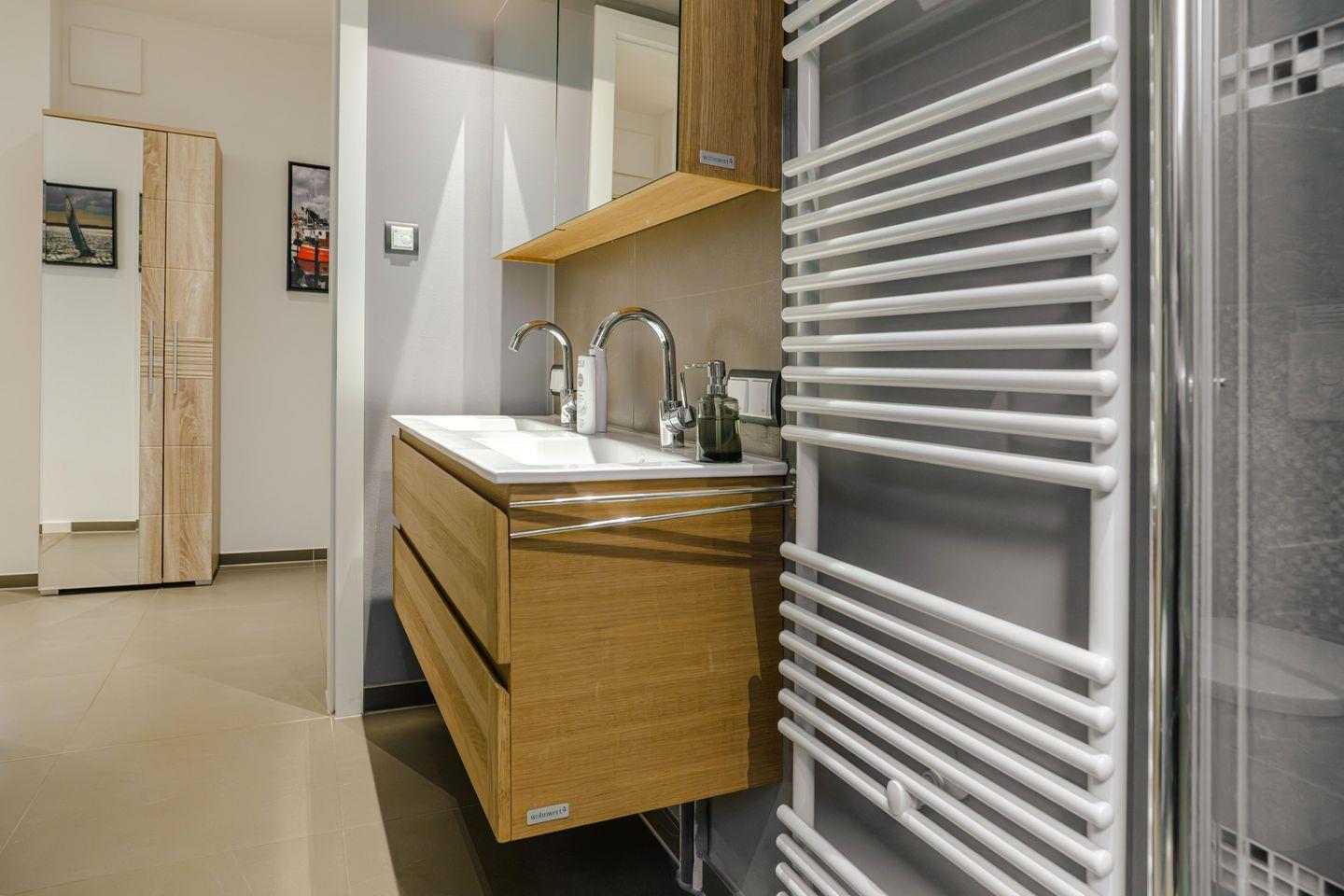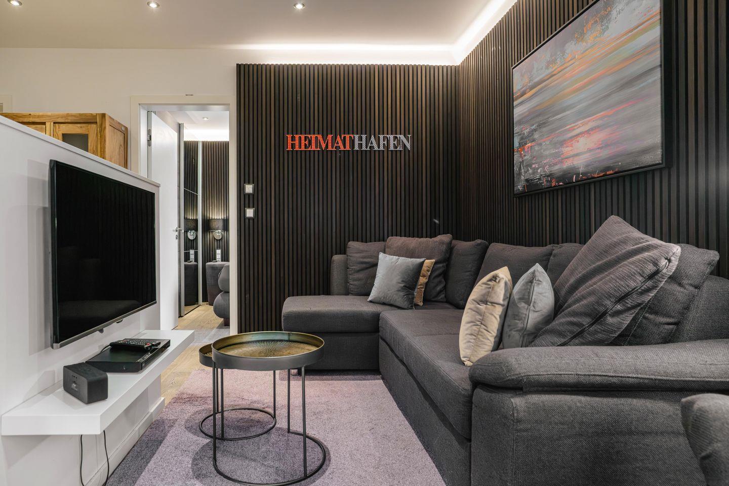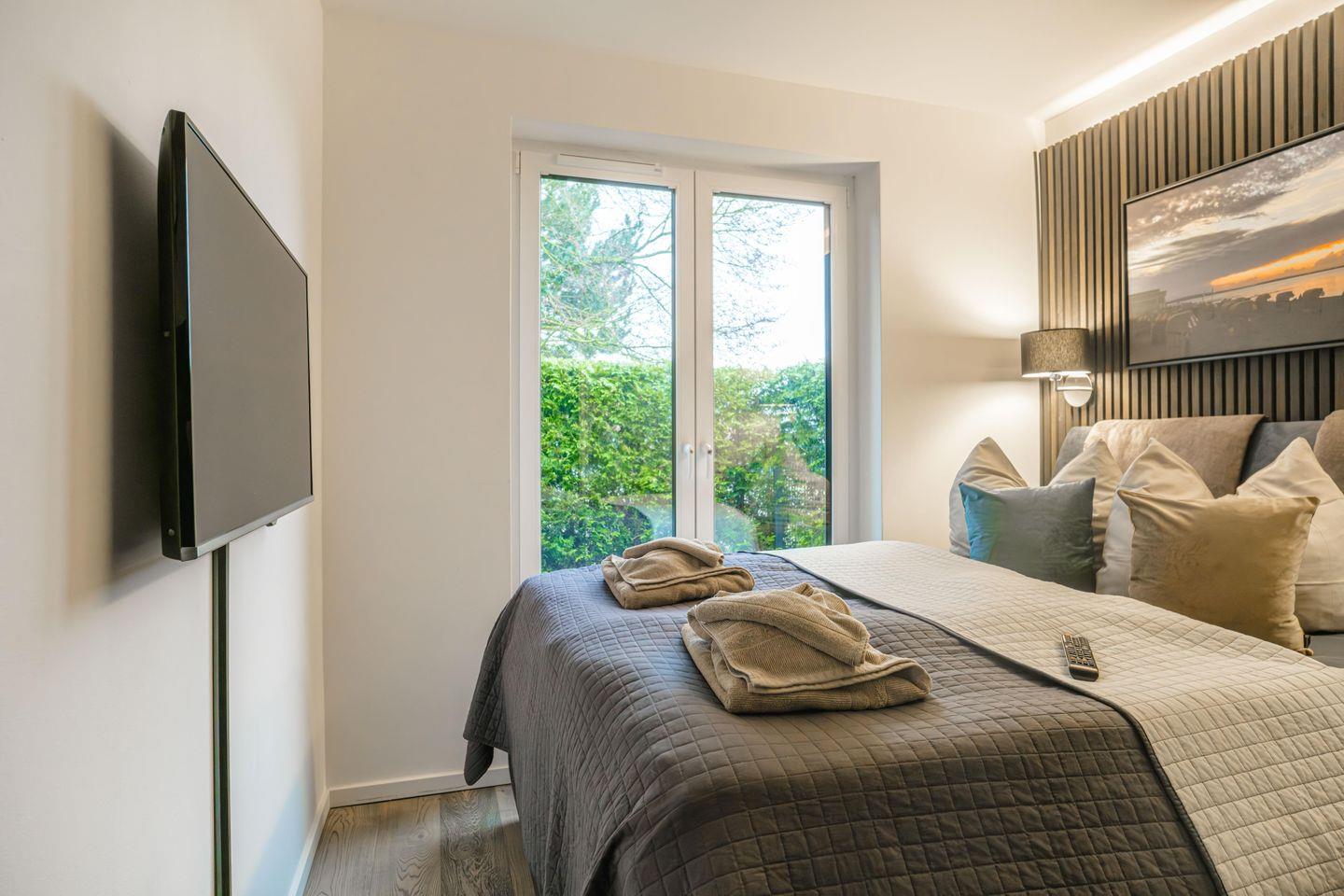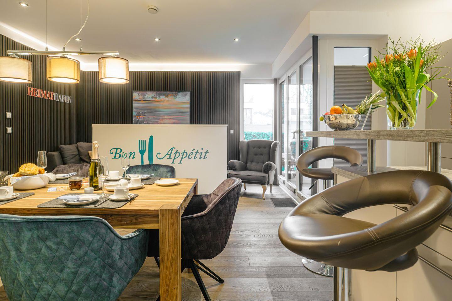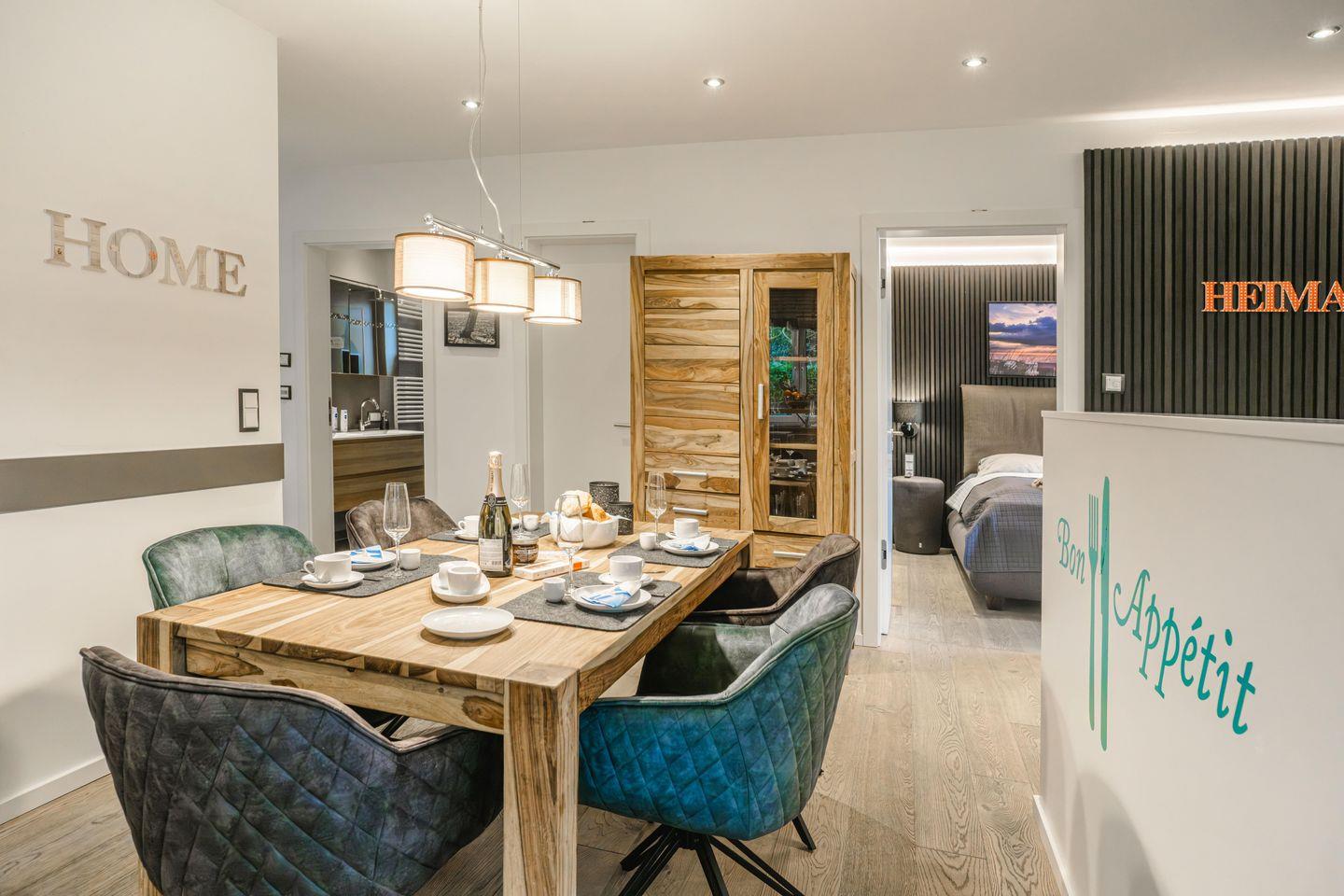 Im Erdgeschoss befinden sich die Ferienwohnungen Muschel und Welle Sie sind jeweils 65 qm groß, für bis zu sechs Personen konzipiert und zeichnen sich durch ihre helle Gestaltung, den Echtholz-Parkettboden mit integrierter Fußbodenheizung und ihre ebenso gemütliche wie stilvolle Einrichtung aus.