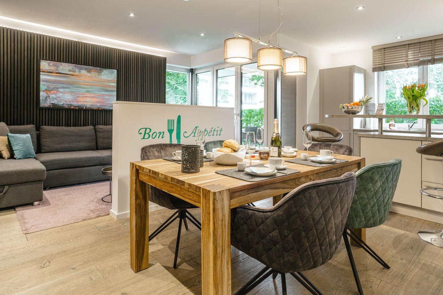 Mittelpunkt beider Wohnungen ist der offene Wohnbereich, der Küche, Wohn- und Essbereich miteinander verbindet. Das Highlight ist ein separater Gartenbereich, wo Sie frühstücken oder gemütlich entspannen können.